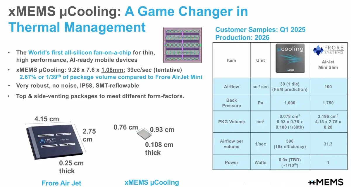 Компания xMEMS анонсировала «охлаждающий чип» xMEMS XMC-2400 µCooling. Это микроэлектромеханическая система, которая использует ультразвуковые вибрации для создания потока воздуха.