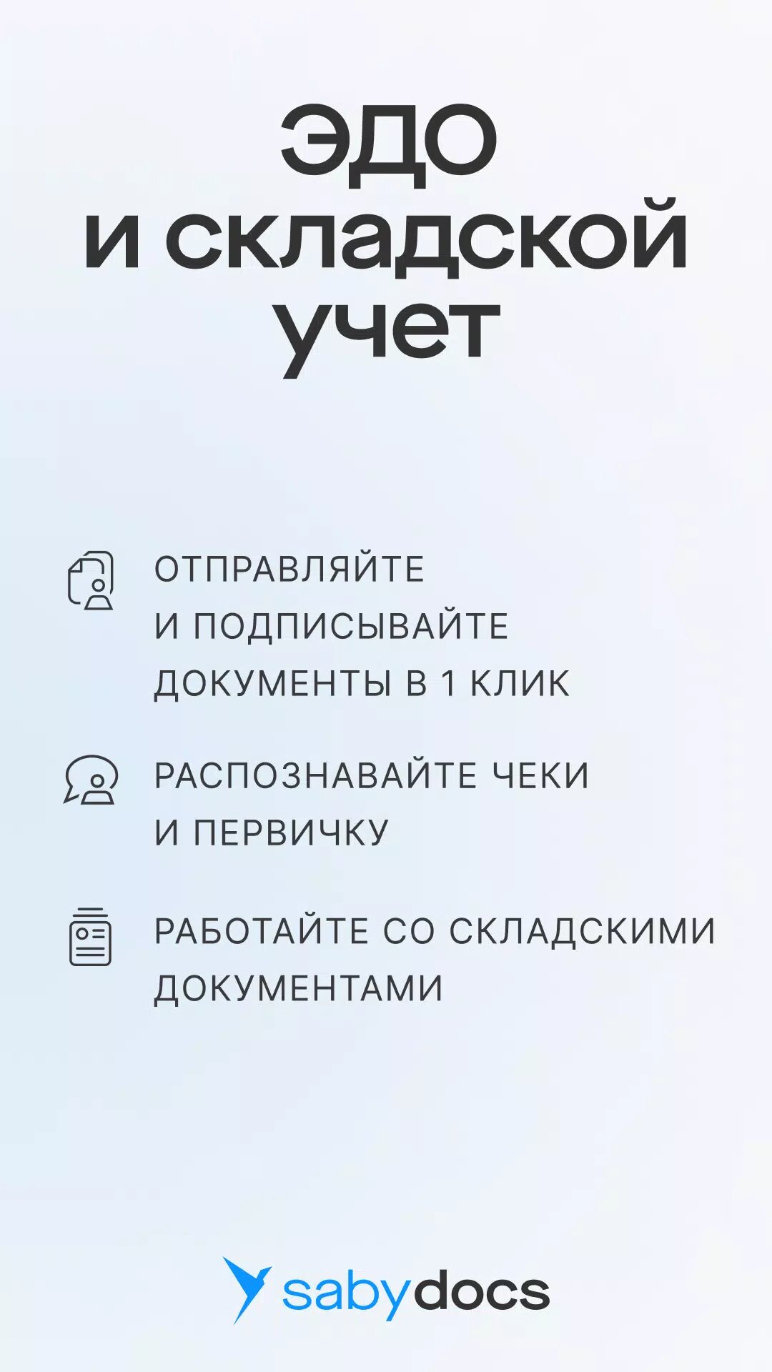 Saby Docs — это программа для электронного документооборота и складского учета. Прием, отправка и подписание документов: акты, счета-фактуры, накладные и другие типы — онлайн в один клик. Распознавание первички и чеков. Оформление складских документов: реализации, поступления, счета, заказы, возвраты поставщику. Работа с каталогом. Учет товаров с маркировкой.