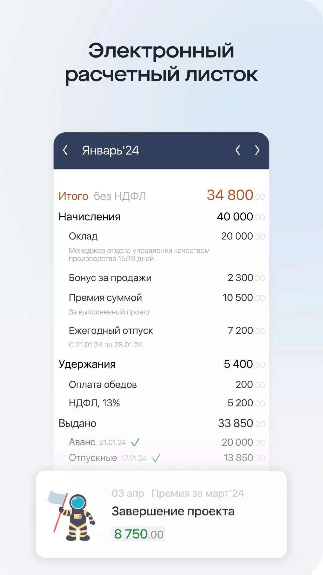 - Ваш расчетный листок — контролируйте зарплату, выплаты, премии.