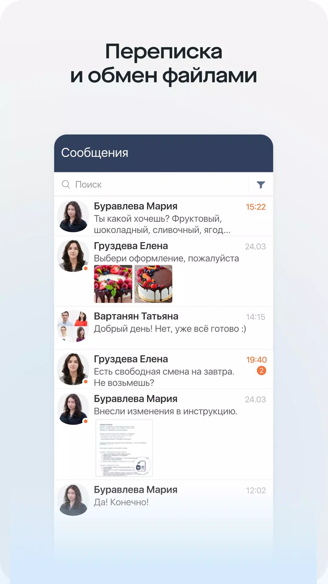 - Переписка — всегда на связи с руководителем, коллегами, бухгалтерией, кадровиками.