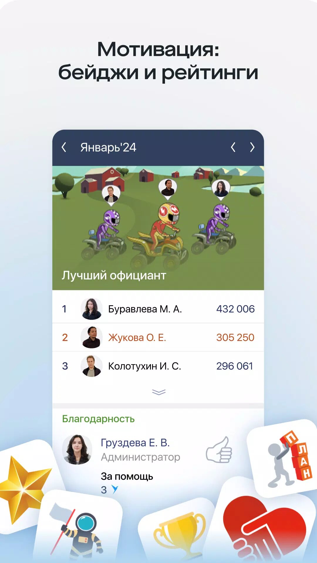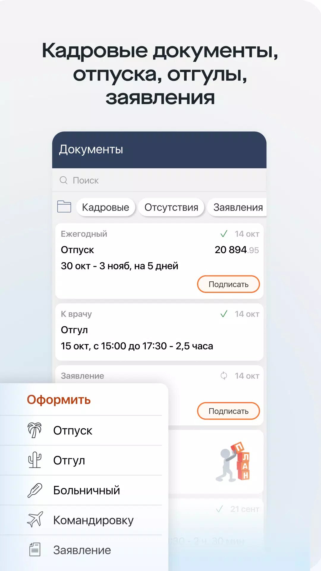 - Кадровые документы, приемы, переводы, отпуска, отгулы, заявления — оформляйте и подписывайте прямо в приложении.