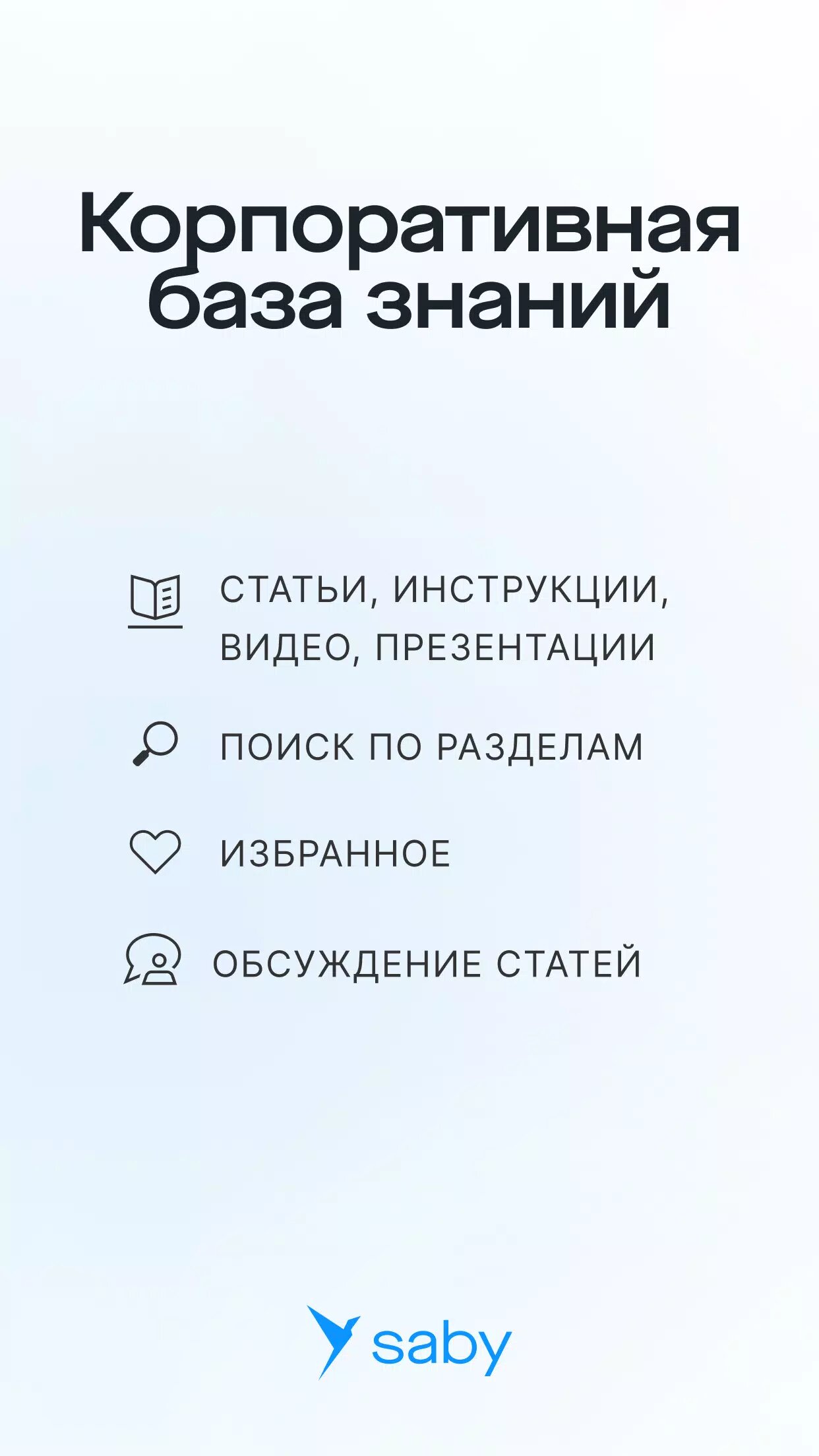 Saby Know — это корпоративная база знаний. Площадка, где хранятся статьи, инструкции и другие материалы вашей компании. Поддерживает все популярные форматы: статьи, видео, презентации. Все материалы разложены по тематическим папкам. Статьи можно обсуждать и делиться с коллегами прямо с мобильных устройств.