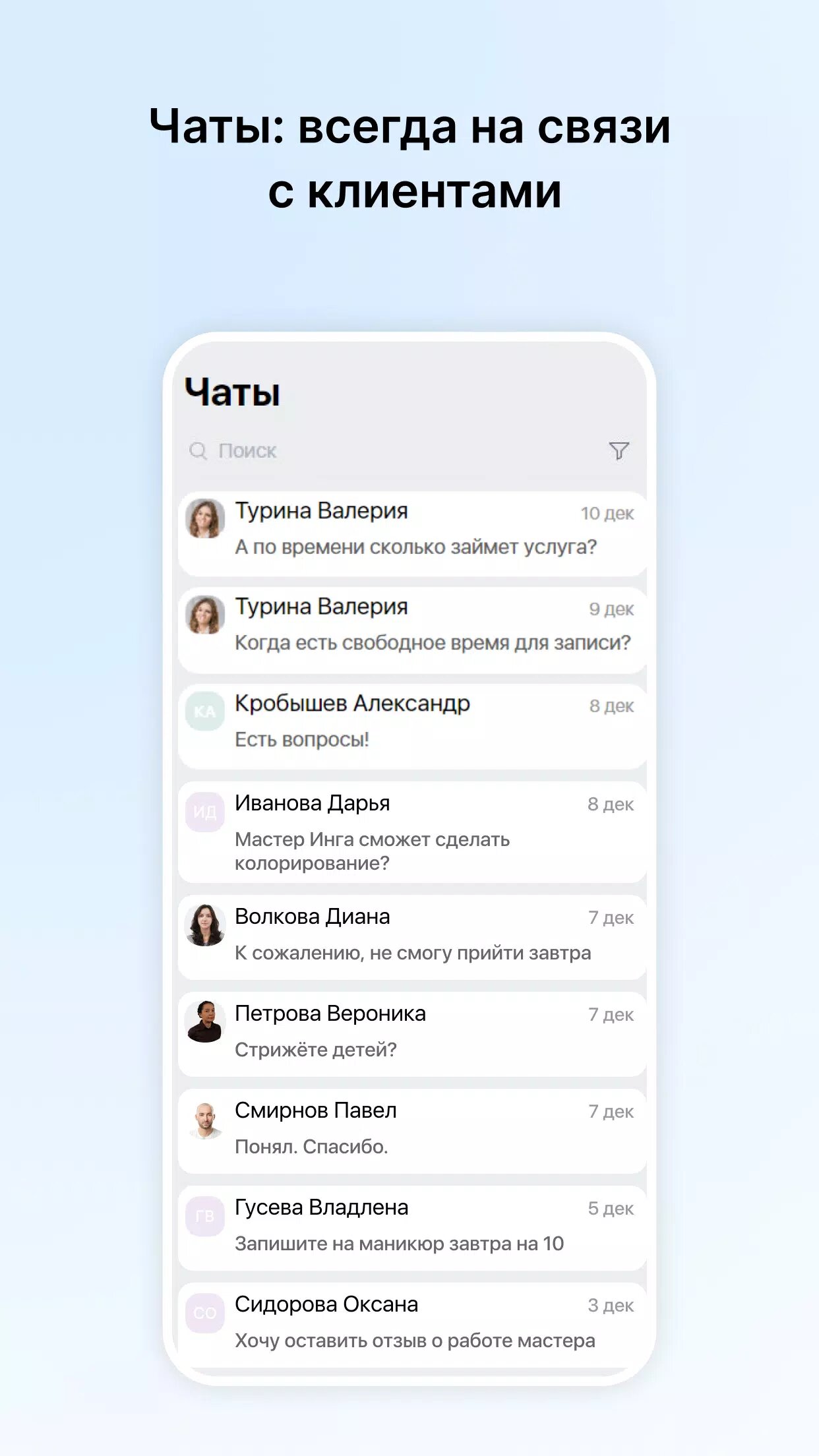 Уточняйте нюансы записи, собирайте отзывы, отвечайте на вопросы в чатах.