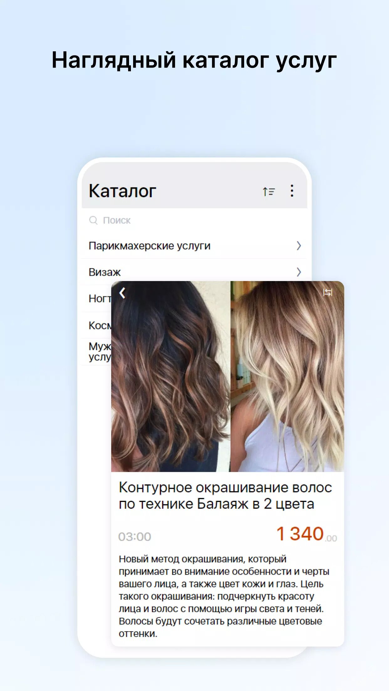 Делите услуги на категории, создавайте карточки каждой услуги с подробным описанием, фото и ценой.