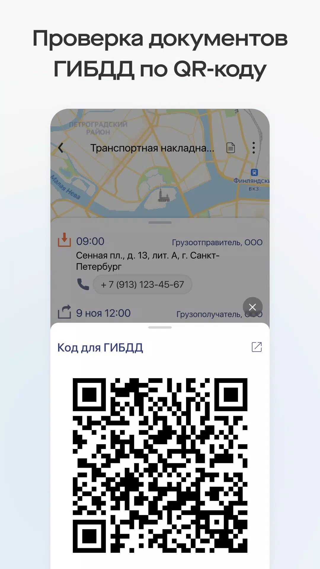 - Работайте с путевыми листами и транспортными накладными: добавляйте точки в маршрут, отслеживайте показатели топлива и одометра, подтверждайте приемку и выдачу груза, предьявляйте документы ГИБДД по QR-коду с вашего устройства.