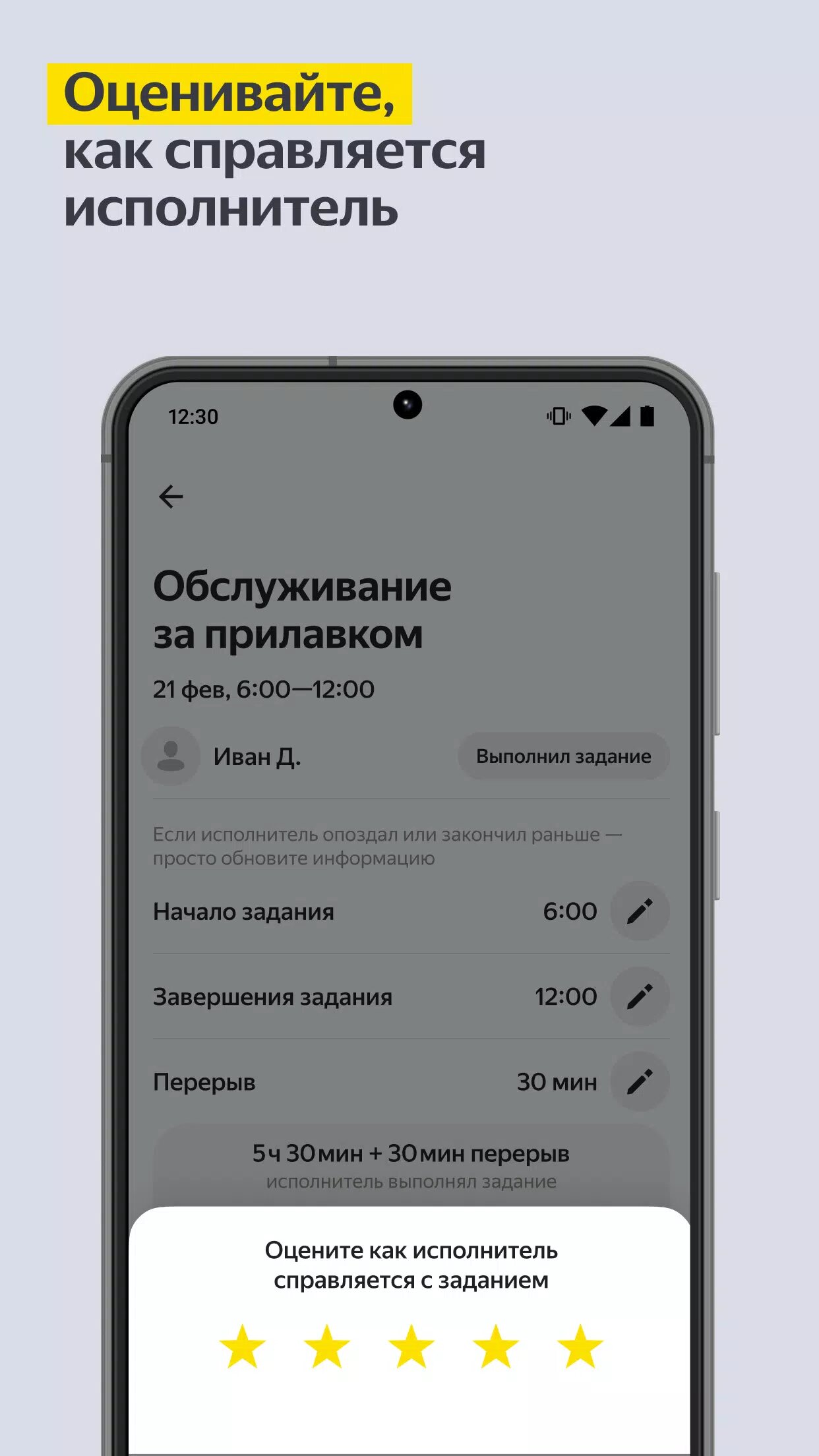 - подтверждайте время начала и окончания задания — прямо в приложении, одним кликом,