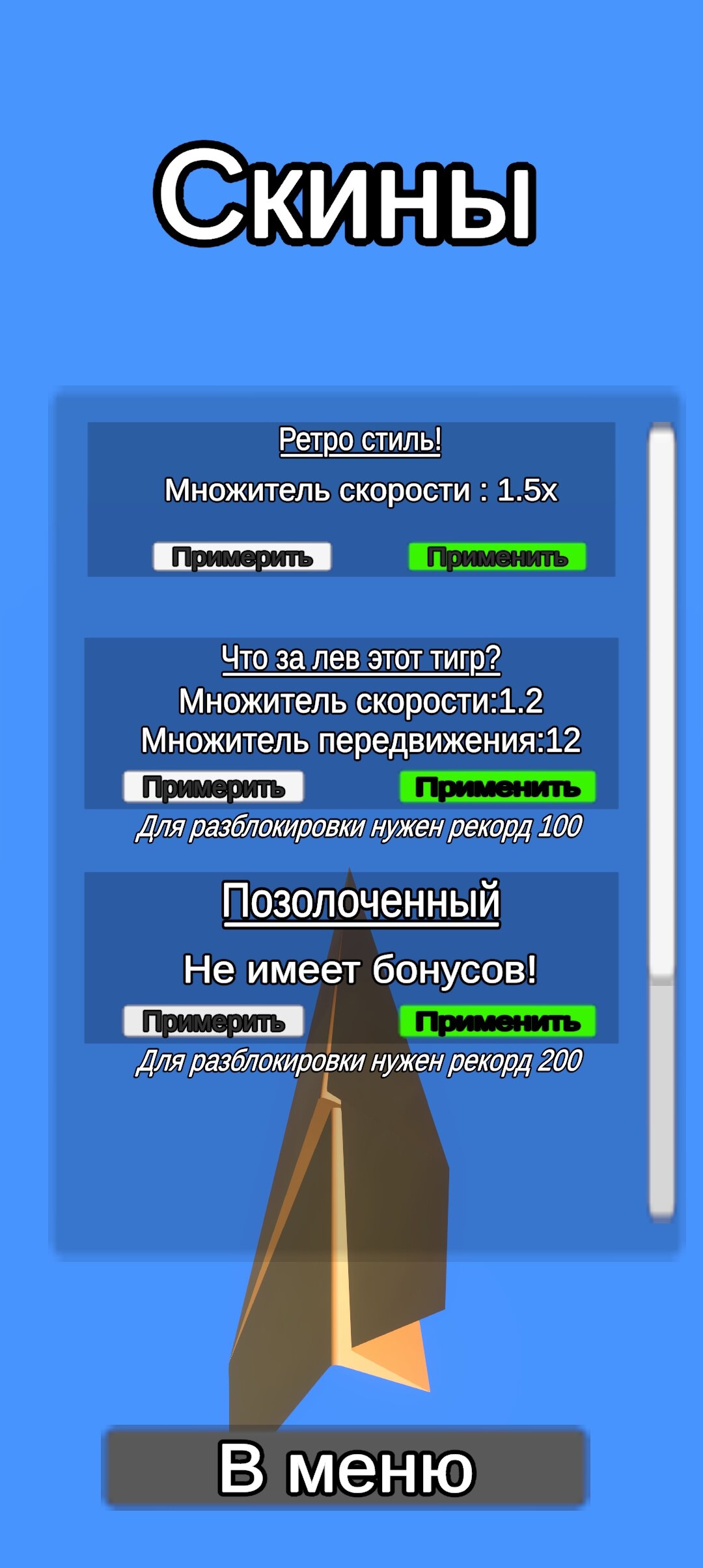 - Кастомизация: Применяйте уникальные скины для самолёта, которые дают бонусы (например, ускорение и передвижение).