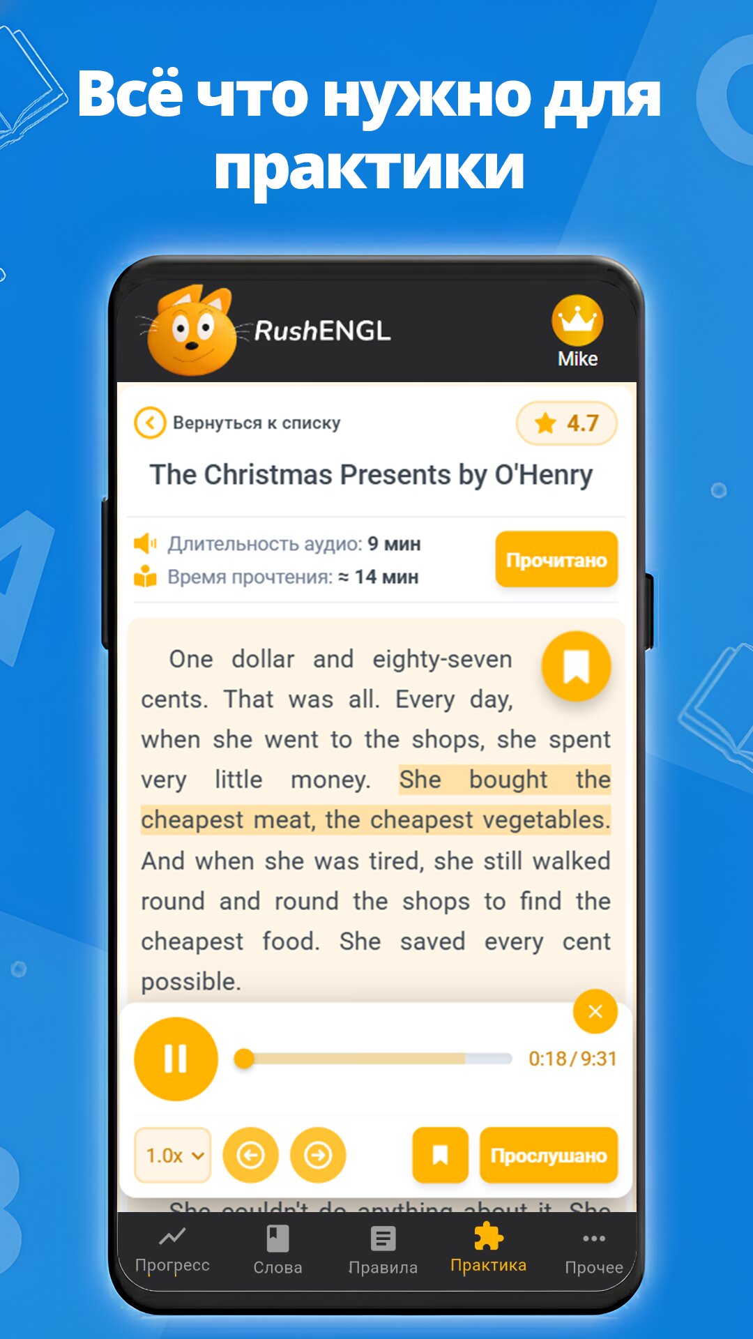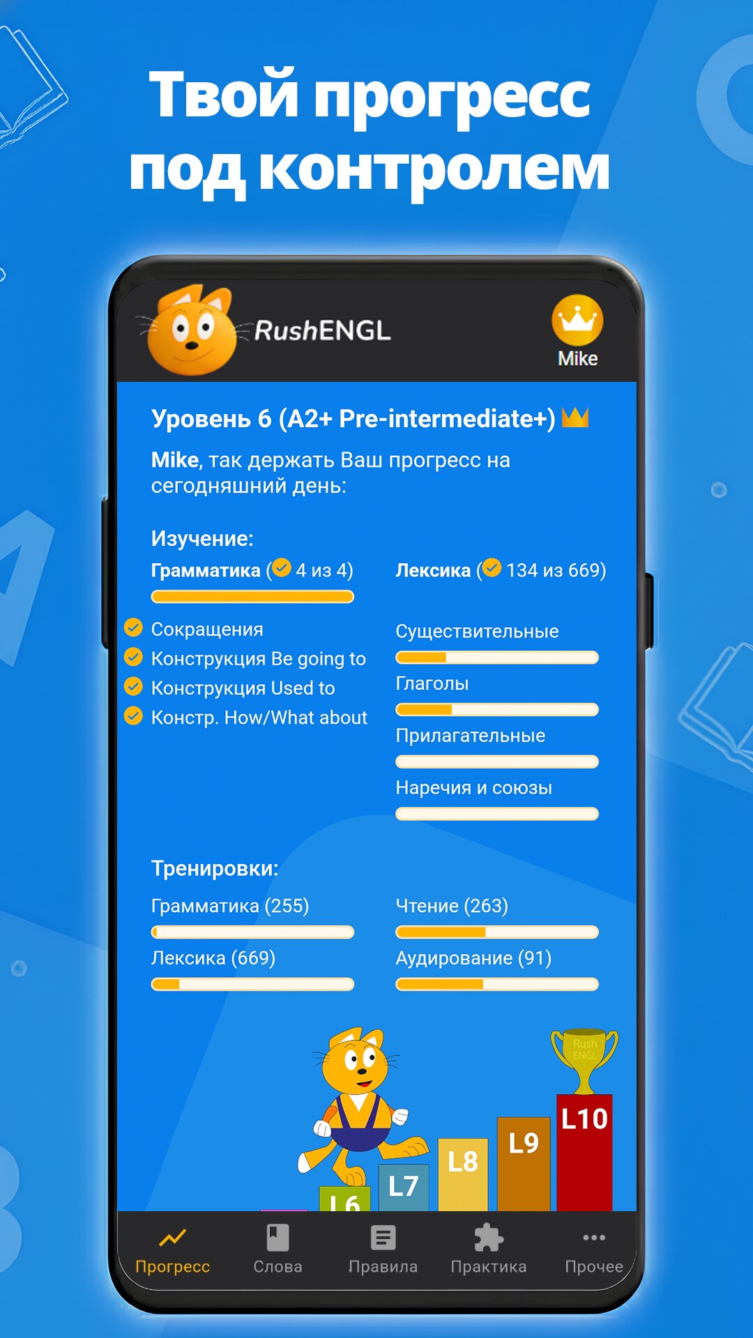 RushENGL предлагает всё необходимое: эффективные инструменты для запоминания слов, тренировку звуков и транскрипций, доступную грамматику с интерактивной практикой, а также богатую библиотеку адаптированных текстов, рассказов, аудиокниг и видеоматериалов для всех уровней.