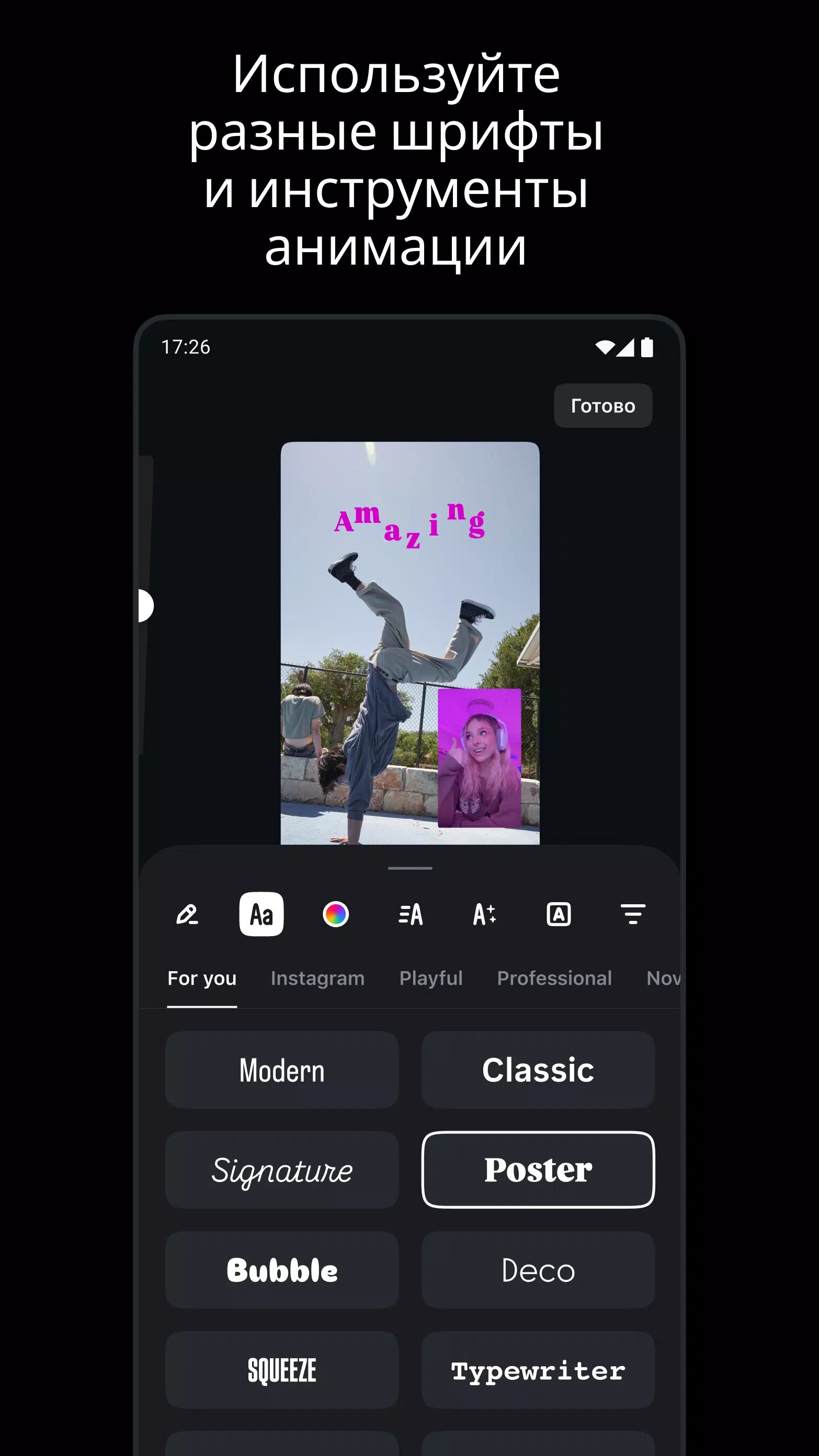 — Выбирайте из множества шрифтов, звуков и голосовых эффектов, а также фильтров и стикеров.