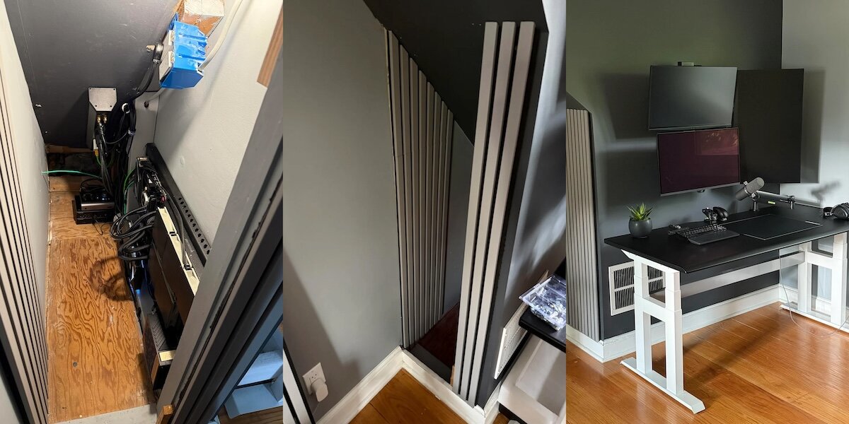 Энтузиаст решил отказаться от традиционных корпусов, соорудив для своего ПК целую кладовку. Внутри есть всё необходимое — шасси для материнской платы, видеокарты и блока питания, мощная система охлаждения и даже аудиокарта. В результате на его рабочем столе кроме мониторов и периферии ничего нет — всё спрятано за стеной.