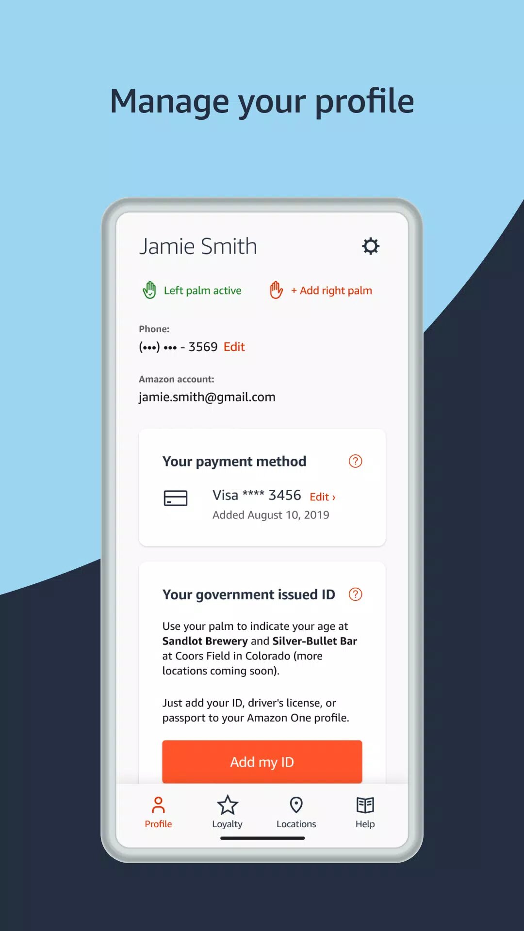 - Просматривайте свой профиль Amazon One и управляйте им.