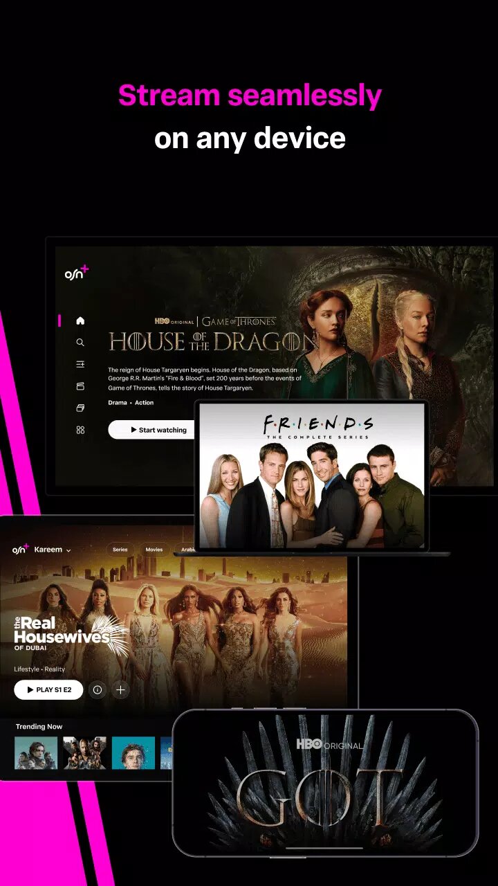 Смотрите фильмы и шоу из коллекции, содержащей более 10 000 часов премиум-контента, адаптированного для каждого члена семьи. С OSN+ вы не просто смотрите потоковую передачу, вы можете погрузиться в контент и смотреть любимые фильмы и сериалы в любое время, в любом месте и на любом устройстве.