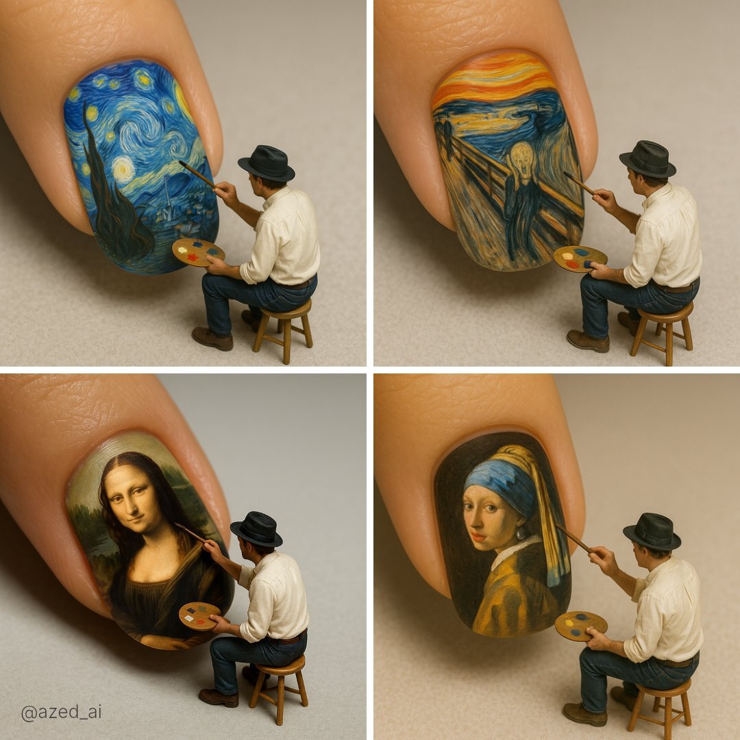 A close-up, hyper-realistic photograph of a tiny artist sitting on a stool and painting a [subject] on a giant human fingernail. The miniature painter holds a round palette and a thin brush, carefully recreating the soft lighting and detailed brushwork of the classic masterpiece.