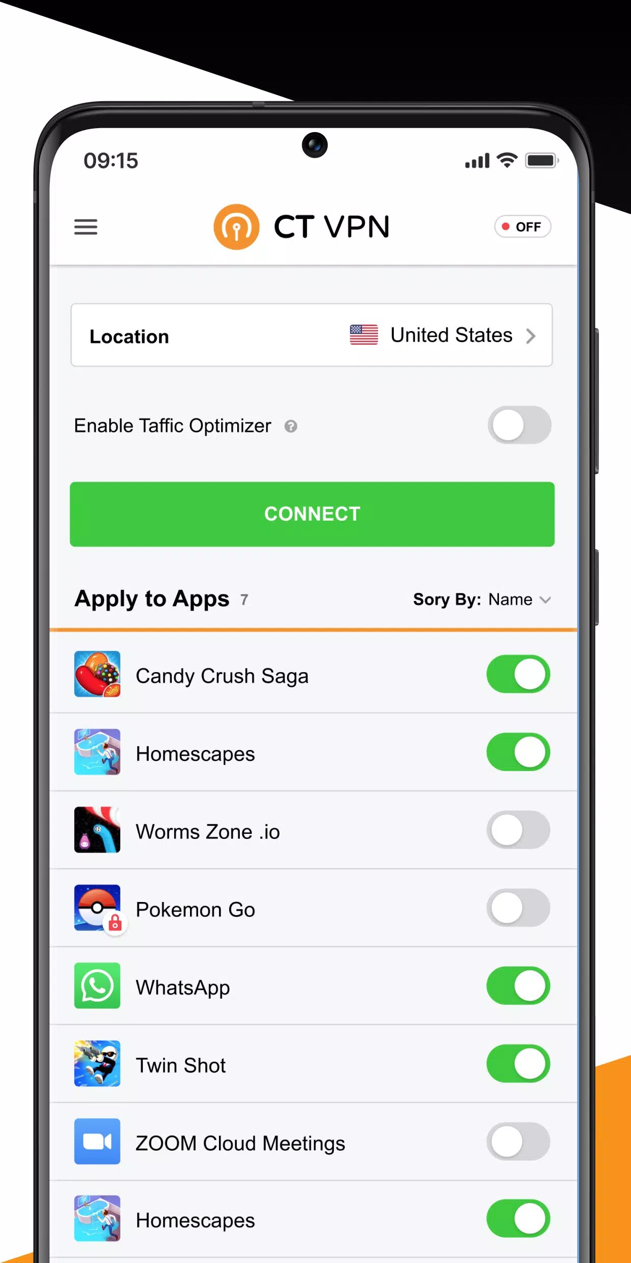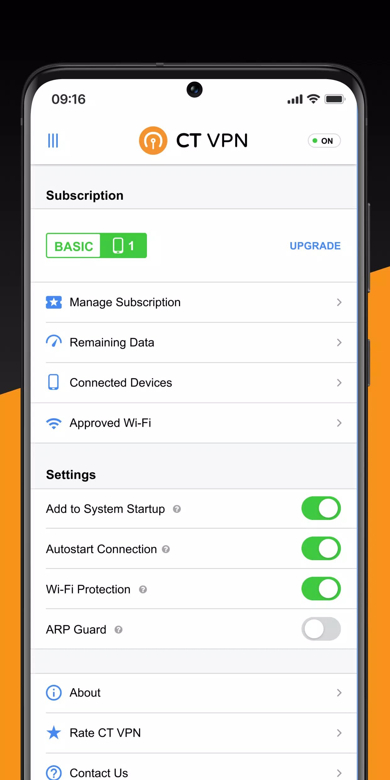 - Обеспечьте безопасность данных Wi-Fi с помощью CT VPN и подключайтесь к общедоступной Wi-Fi сети, не опасаясь потери конфиденциальности. С CT VPN вы можете использовать как мобильный интернет, так и Wi-Fi.