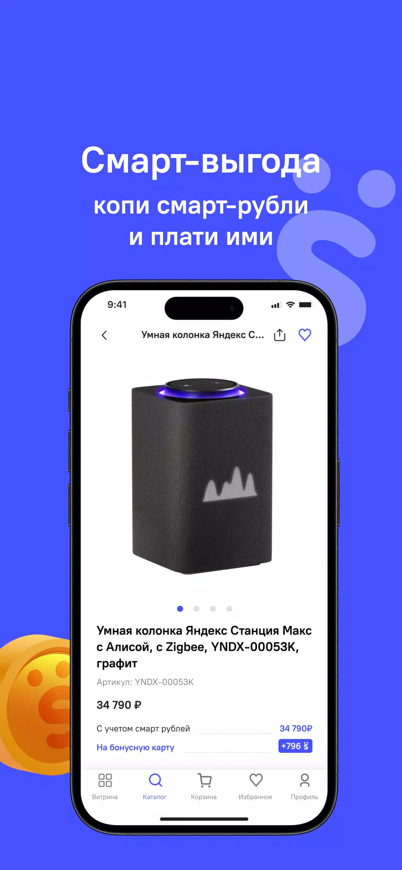 За каждую покупку приходит кешбэк, которым можно оплатить до 30% стоимости следующей покупки. В приложении есть QR-код карты лояльности: чтобы потратить смарт-рубли, нужно показать его на кассе.