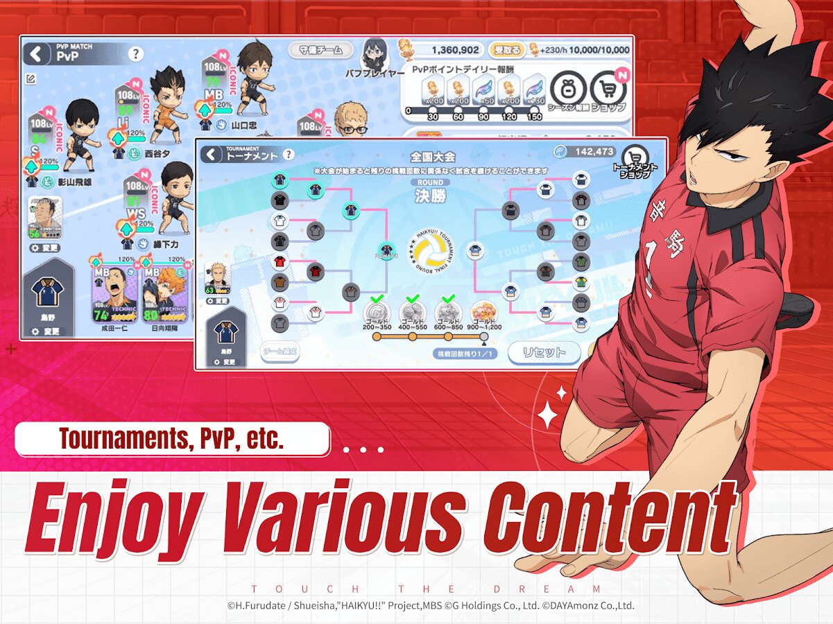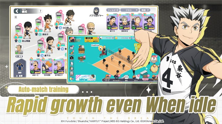 Haikyu! Touch the Dream — это лицензионная игра, основанная на всемирно любимом аниме от Shonen Jump (Shueisha) и TOHO Animation. Испытайте острые ощущения, создавая команду своей мечты, бросая вызов жестоким противникам и переживая культовые моменты волейбола. Благодаря потрясающей графике и игровому процессу, который оживляет историю, эта игра на тему волейбола подарит незабываемые впечатления как фанатам, так и новичкам. Выходите на поле и стремитесь к победе!