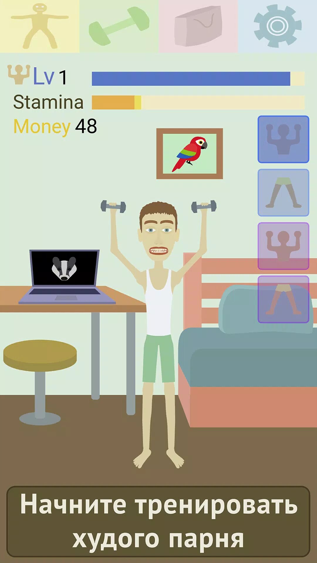 В начале ваш персонаж такой худой, что едва может бегать на велотренажере и не может без одышки поднять гантели! Но ваша миссия состоит в том, чтобы сделать этого парня как можно более здоровым и мускулистым. Единственный способ сделать это — заниматься спортом.