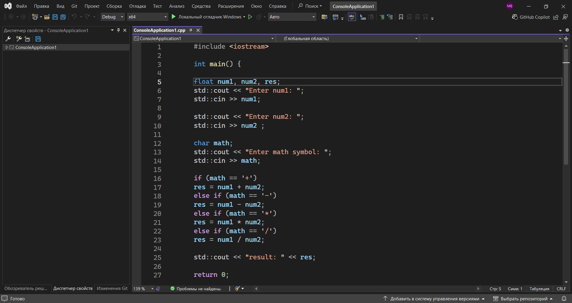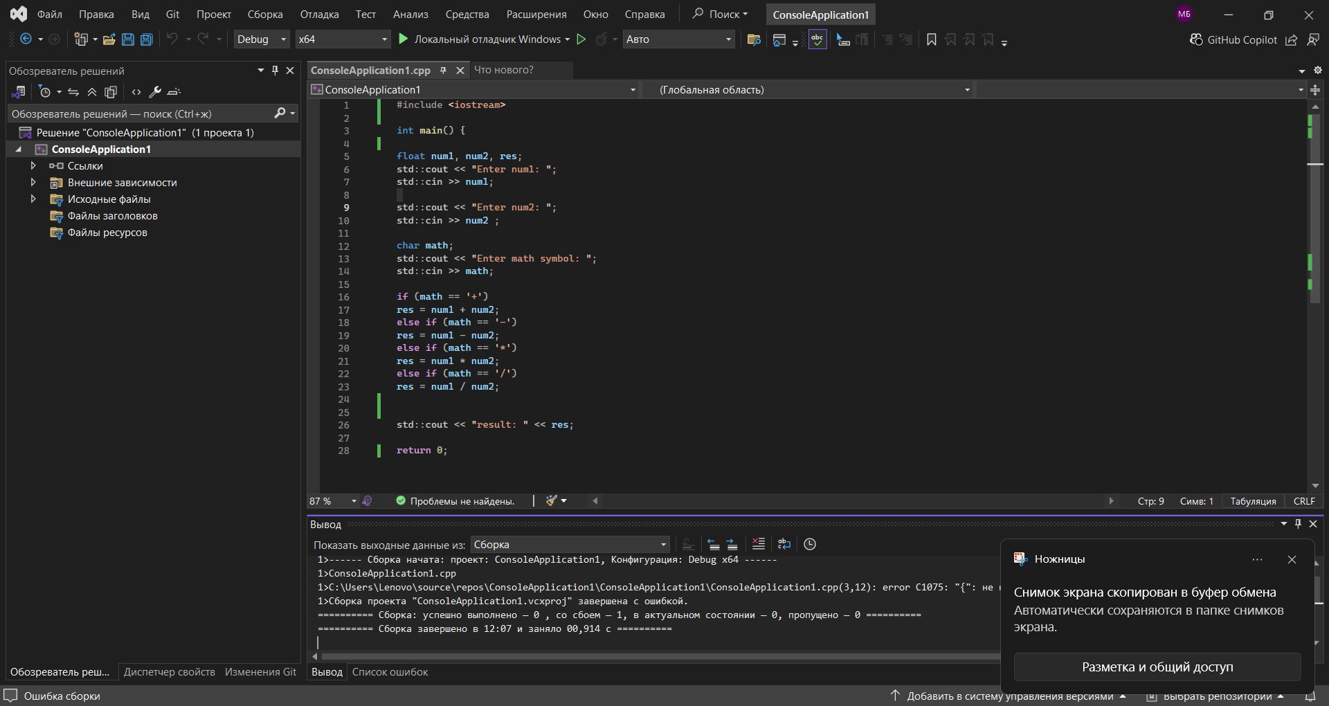 2 июля 2025, 12:13 Как исправить ошибку Вопросы Я с этой ошибкой в програме 2 дня разбираюсь ничего не получается тут всё норм? есть ошибки? а? M2000 @M2009 Начинающий создатель PC игр. Ryzen 5 3500U / Radeon Vega 8🇷🇺 23 комментария по лайкам по дате Оставьте комментарий... Tenn888 4 месяцаОпытный Довакин Ошибка находится в конце. Вы не закрыли int main() в конце фигурной скобкой. Также если я правильно знаю, то все структуры if-else также должны работать с фигурными скобками, но это не точно (я не сильно знаю C++). M2009 4 месяцаRyzen 5 3500U / Radeon Vega 8Автор и мал не закрывать Tenn888 4 месяцаОпытный Довакин ? M2009 4 месяцаRyzen 5 3500U / Radeon Vega 8Автор нет никаких фигурных скобок не cтавить иф елсе Tenn888 4 месяцаОпытный Довакин Вам виднее columbus 4 месяцаФанат Хогвартса как по твоему кто-то скажет есть ли у тебя ошибка, если ты заскринил лишь часть кода :) M2009 4 месяцаRyzen 5 3500U / Radeon Vega 8Автор полностью M2009 4 месяцаRyzen 5 3500U / Radeon Vega 8Автор M2009 4 месяцаRyzen 5 3500U / Radeon Vega 8Автор вот код M2009 4 месяцаRyzen 5 3500U / Radeon Vega 8Автор это полностью мой код columbus 4 месяцаФанат Хогвартса я понимаю, что это твой код но найти ошибку в коде по его кусочку довольно трудная задача Tenn888 4 месяцаОпытный Довакин Так человек даже закрыл консоль, а там ошибка описана.