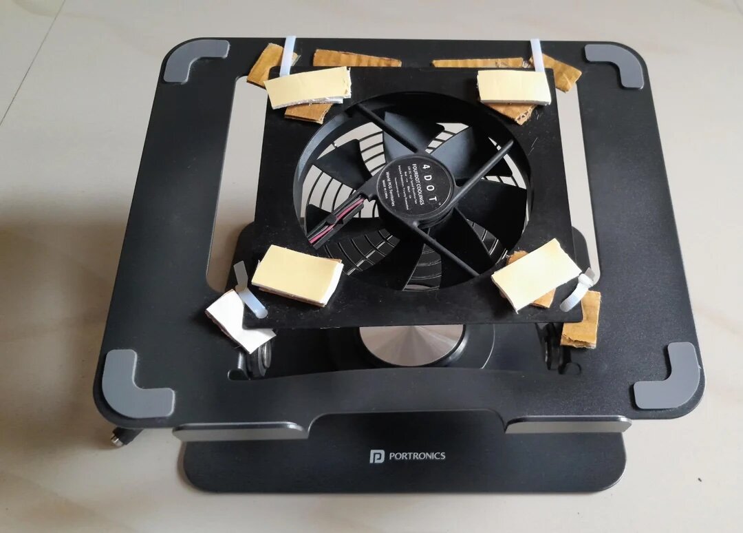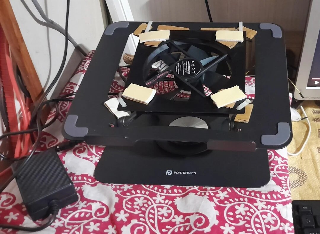Соответственно, энтузиаст взял подставку для ноутбука Portronics K9, а затем разместил на ней серверный вентилятор с диаметром лопастей 120 мм (2500 об/мин). Этого оказалось достаточно, чтобы охладить ноутбук без лишнего шума.