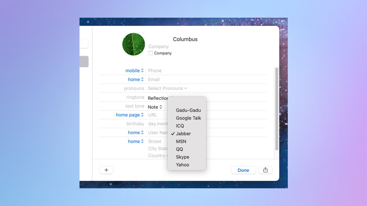 В приложении «Контакты» до сих пор (даже в macOS 26 Tahoe) можно добавить информацию об этих «мёртвых» мессенджерах.