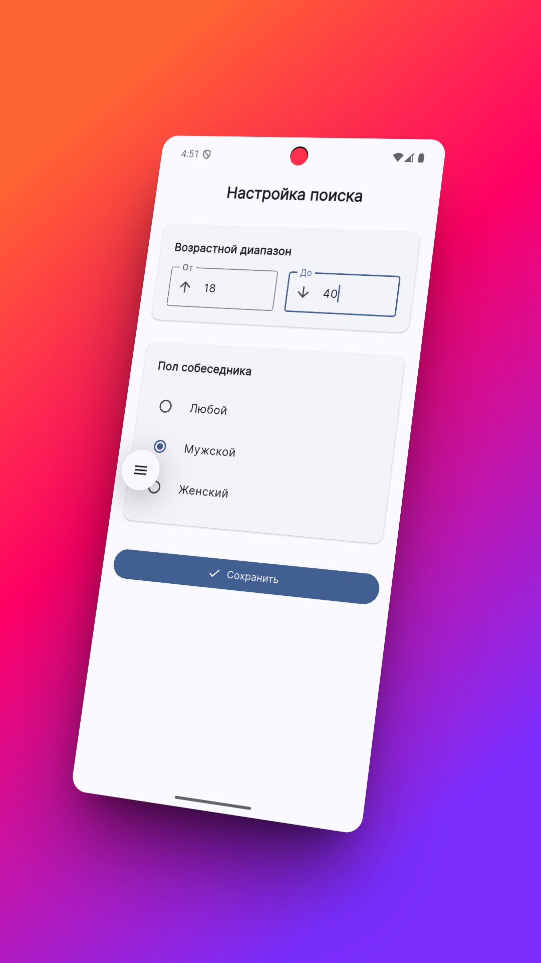 Случайные знакомства по параметрам — выбирайте пол и возраст, чтобы находить интересных людей именно для вас.