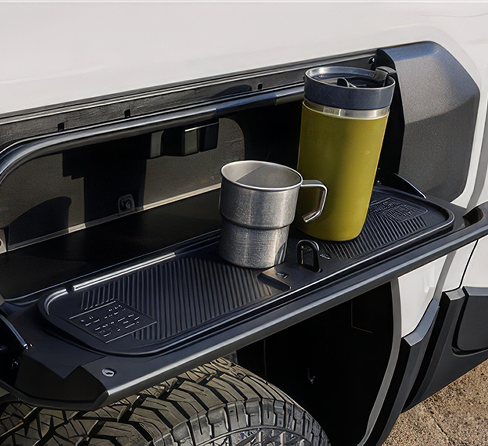 Ну и на этом закончим со скучными цифрами и фактами. Давайте уже к самому спорному — внешности. И знаете, она мне нравится! Несмотря на действительно странное выражение лица и не менее странное оформление колесных арок, получается достаточно цельный образ. Опять же, здесь достаточно много деталей, которые на первый взгляд ускользают, но показывают, насколько дизайн проработан. Передний бампер скошен по краям для лучшего угла въезда, в заднем бампере подножки, да и черная вставка на капоте выглядит хоть и странно, но не чужеродно. Кажется, что без нее даже было бы хуже. А вставки из черного пластика над колесными арками вполне функциональны — если вы приложились, их можно поменять отдельно, в задней левой прячется горловина бензобака. А за доплату, из этой же вставки можно заказать небольшой походный столик! Вставки за задним стеклом кабины красиво закругляют кабину, как будто бы стекло выгнуто, да и рейлинги на крыше в топ-версии неплохо вписаны. Ну и по-умному, весь низ дверей и кузова закрыт черным пластиковым обвесом. Ну и если сильно долго вглядываться, в профиль он будет напоминать Jeep Gladiator, а спереди будет мерещится не то старый американский пикап, не то ЗиЛ-130. Но это уже если сильно дать волю фантазии.
