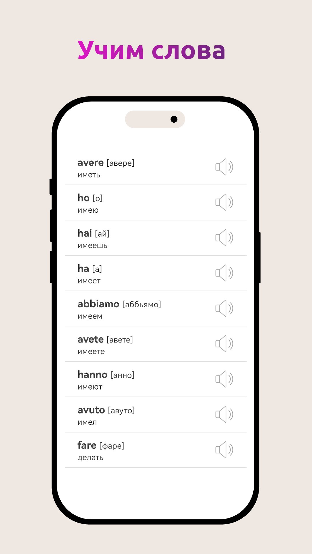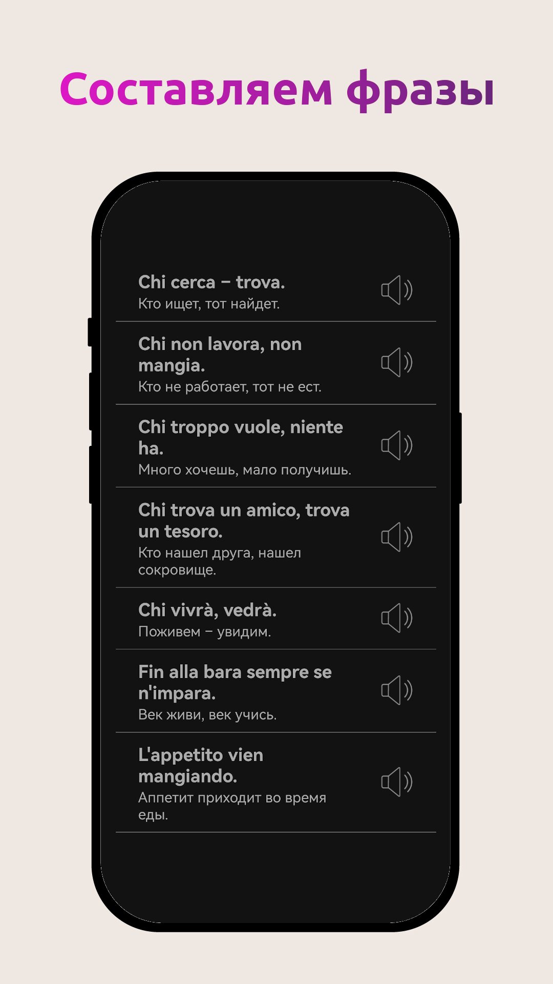 «Аудирование» — тренировка понимания итальянских слов и фраз контекста на слух.