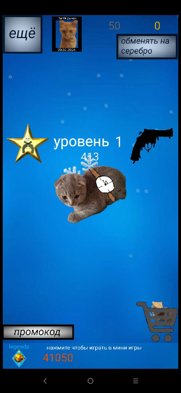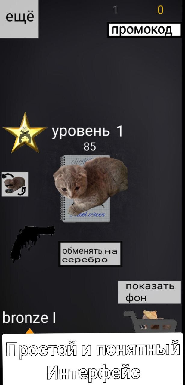 Суть игры чтобы кликать на кота и получать «клики» чтобы обменять на «серебро» .