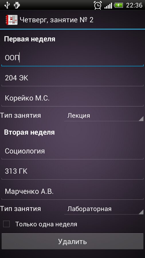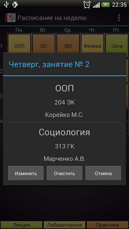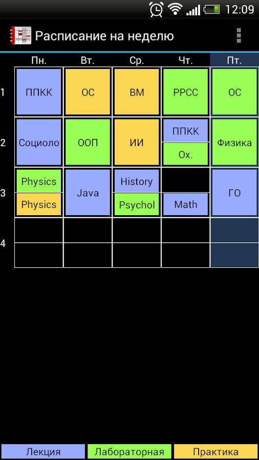 Достаточно один раз ввести расписание – и оно всегда представлено в удобном табличном виде на всю неделю. Каждый предмет выделяется цветом в зависимости от типа занятия – лекция, лабораторная или практика.