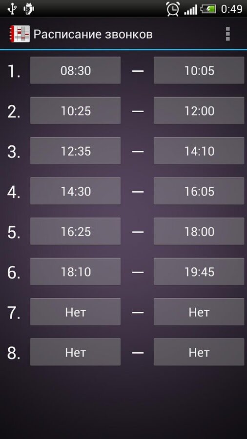 Также можно ввести расписание звонков, чтобы всегда быть в курсе, во сколько начинается и заканчивается занятие. Время начала и конца занятия будет показано на виджете.