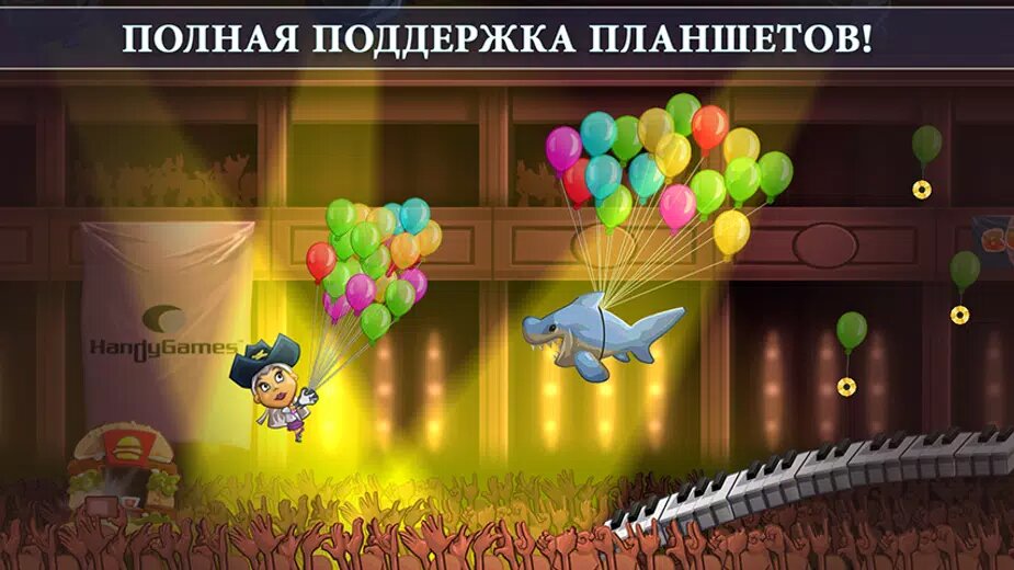 Разбей свою гитару, разгонись и прыгни в приветствующую тебя толпу! Устрой серфинг по концертному залу и почувствуй, как тебя уносит разгоряченная толпа твоих поклонников. Выполняй сумасшедшие трюки, собирай золотые монеты и используй великолепные усиления, чтобы развлечь собравшуюся на праздник толпу! Избегай летающих препятствий, таких как бомбы, бананы и случайный бургер.