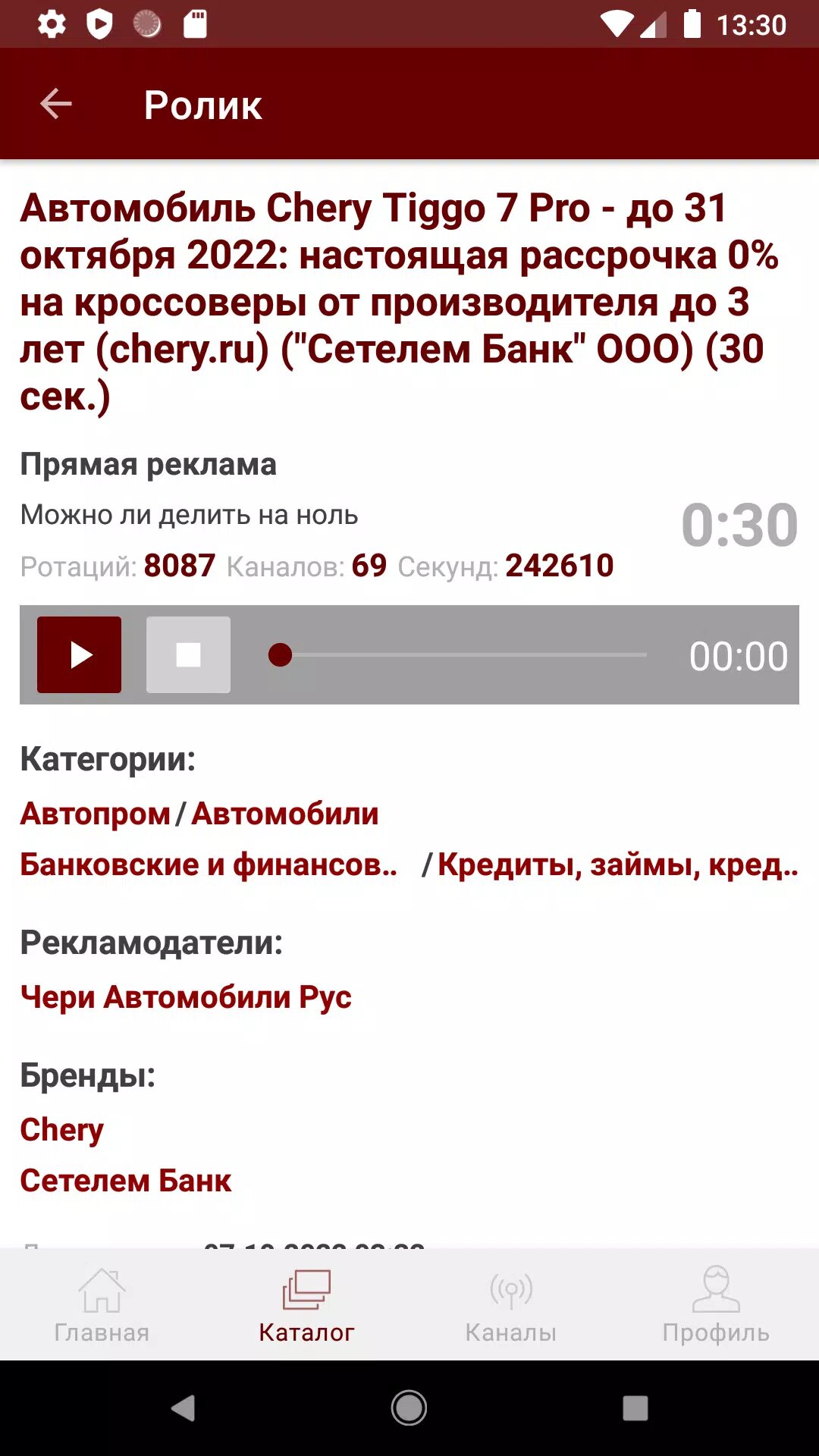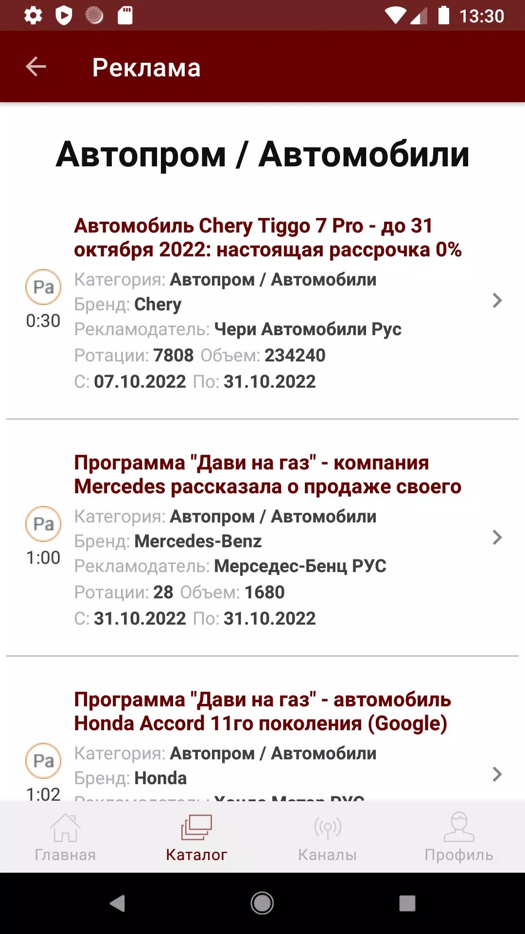 Каждому ролику ставится в соответствие название, описание (первая фраза ролика), категория и подкатегория, рекламодатель, бренд и название товара. Для кобрендинговых роликов дополнительно добавляются бренды и категории. По каждому ролику доступен аудио- или видеообразец. В приложении доступна информация о выходах роликов за текущий месяц по радиостанциям/каналам с числом выходов (секунд).