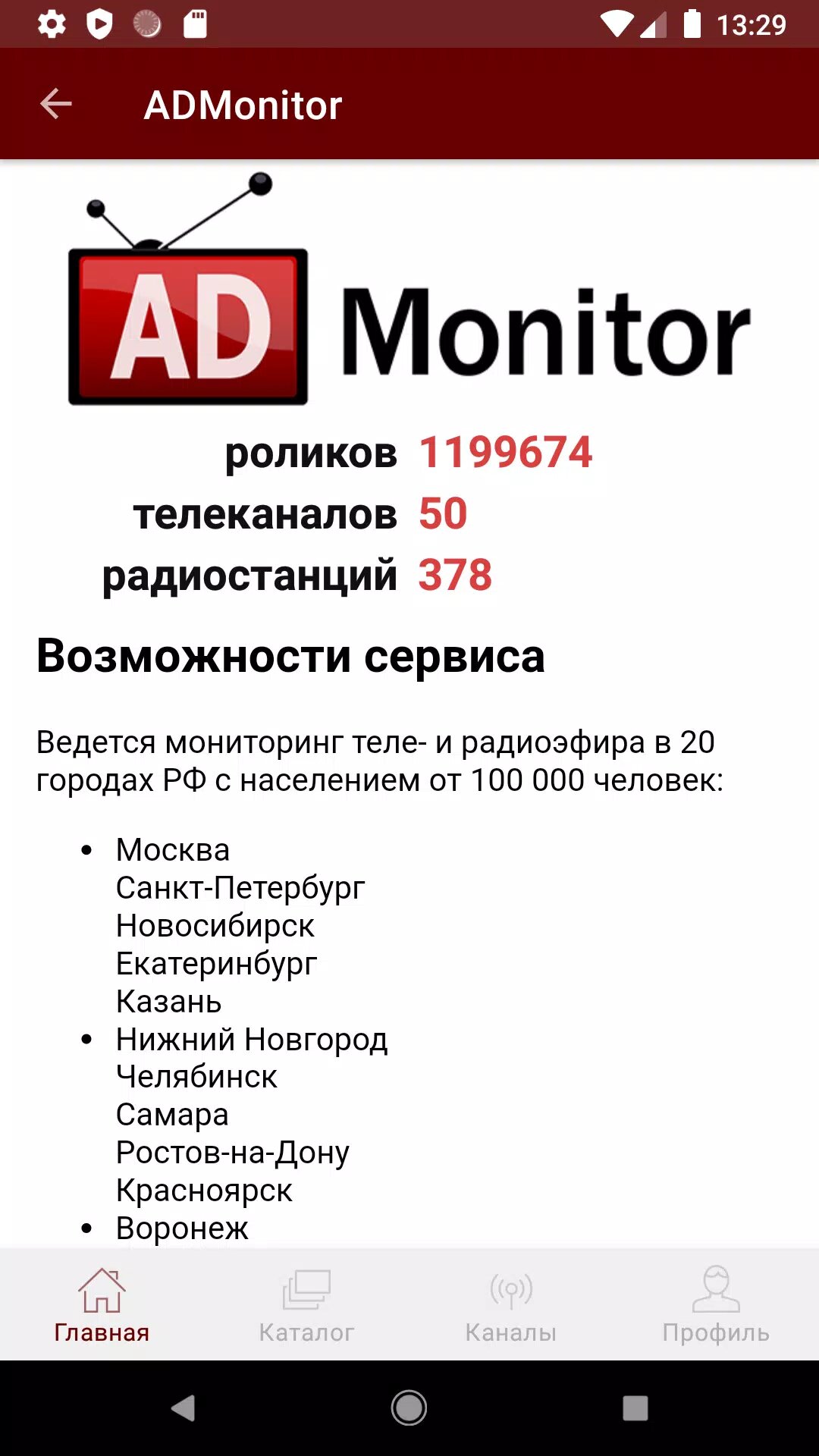 Приложение ADMonitor – это оперативная информация о выходах рекламных роликов на телевидении и радио. Для зарегистрированных пользователей предоставляется доступ к данным за текущий месяц. Информация, доступная в приложении, является частью данных, доступных на сайте AdMonitor.ru. В базе данных сайта хранится информация с 2008 года.