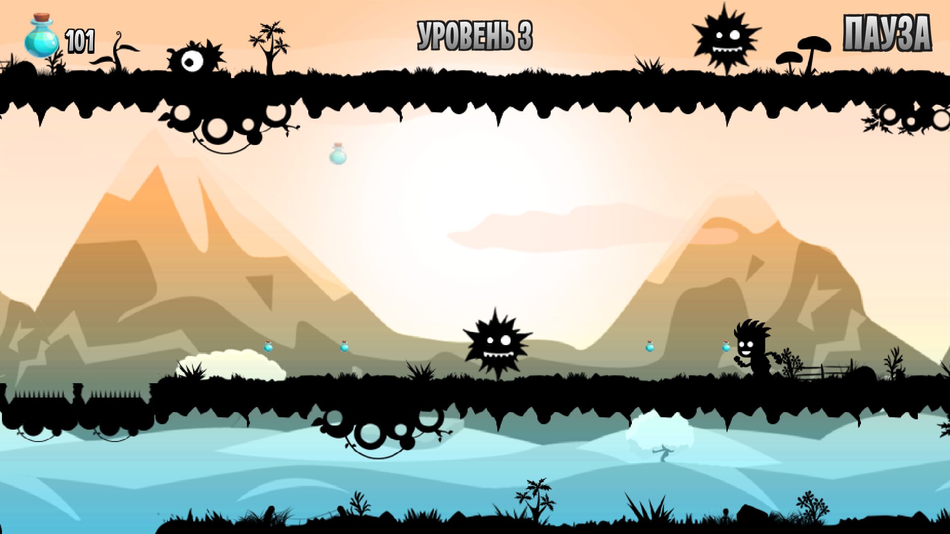 Вы играете за парня, бегущего по опасным джунглям, в котором всё — уровни, монстры и ловушки — выполнено в виде чёрных силуэтов. Ваша цель проста и понятна: пробежать все уровни, собирать зелья для набора очков и выживать.