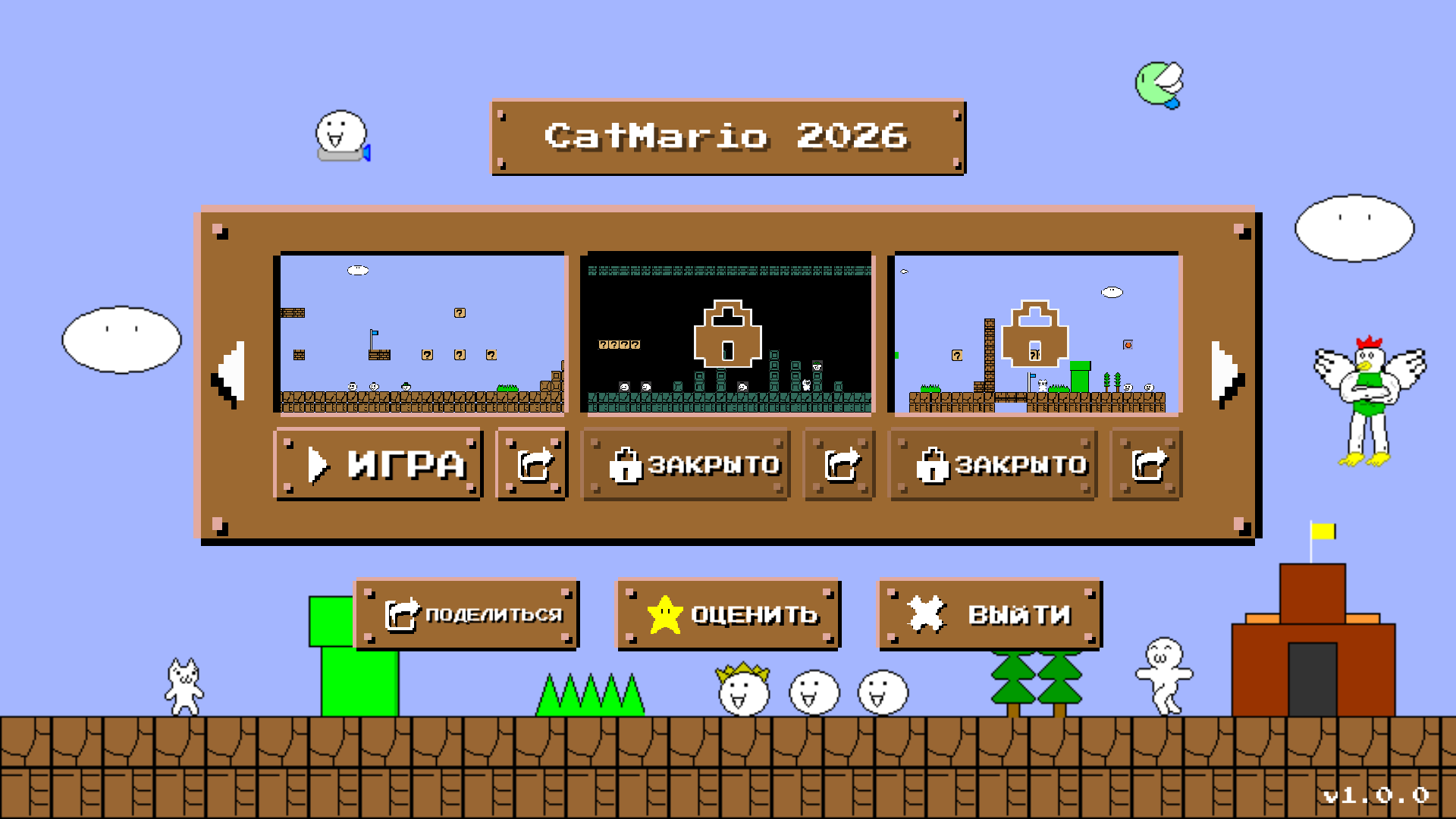 Cat Mario 2026: Syobon Action — 2D платформер в духе супер марио с денди. Кот Марио на первый взгляд кажется простой игрой, но она содержит множество неожиданных ловушек, что делает её захватывающей и соревновательной. Платформер содержит несколько десятков сложных и непредсказуемых уровней, где вам нужно запомнить как проходить ловушки и в итоге добраться до финиша.