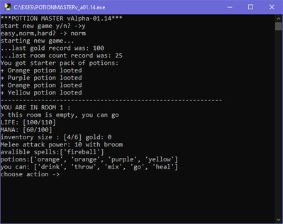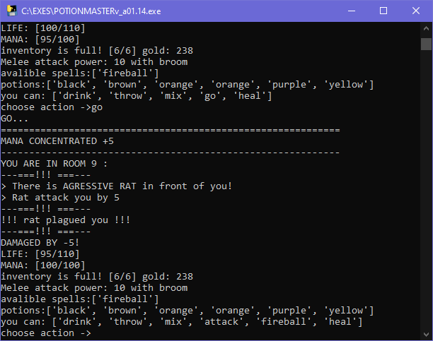 POTION MASTER Альфа-версия 1.14 — 25 января 2026, 11:37 Игры / Для компьютера / Выживание POTION MASTER Альфа-версия 1.14 Простой текстовый рогалик про подземелья, магию, смешивание и дегустацию неизвестных цветных зелий и внезапные эффекты. Язык: потраченный инглишОбновлено: 25 января 2026, 11:48. alexpanovbarnaul Пользователь Комментариев пока нет Оставьте комментарий...