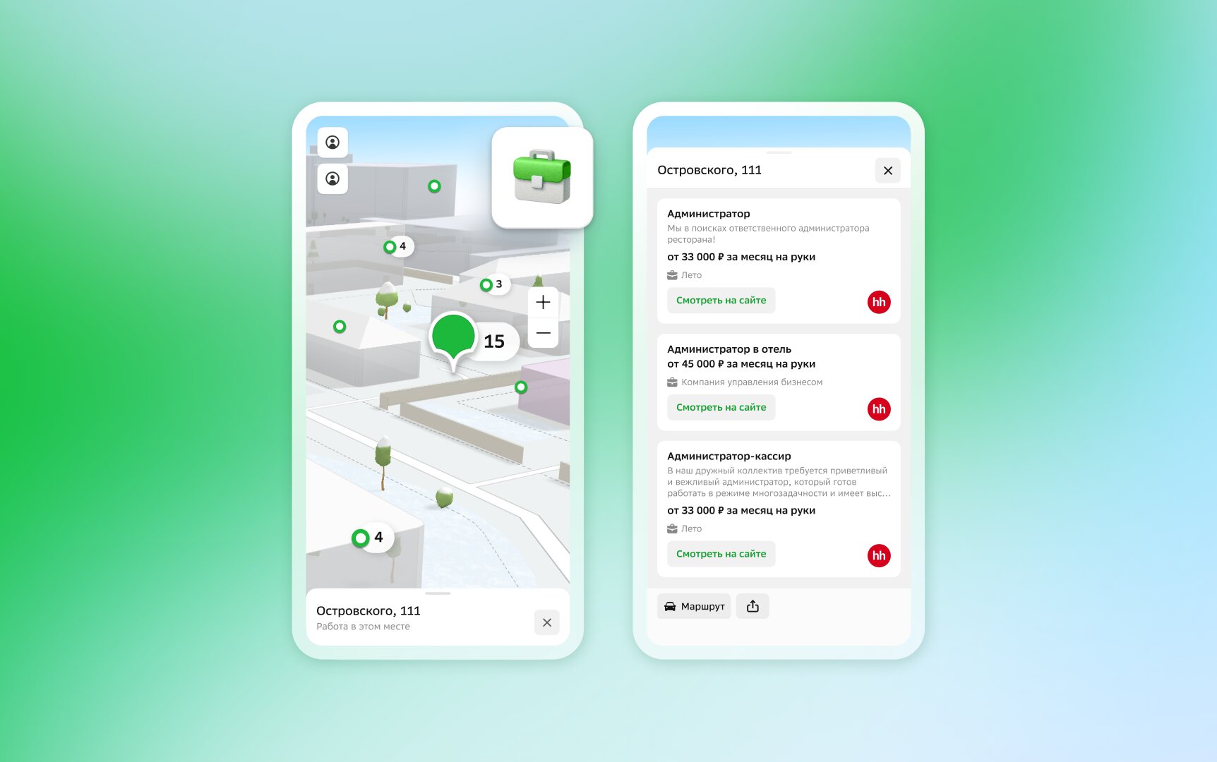 Если в одном здании есть несколько компаний, которые ищут сотрудников, это отразится на маркере, где будет указано количество вакансий. Клик по нему раскрывает полный список предложений.