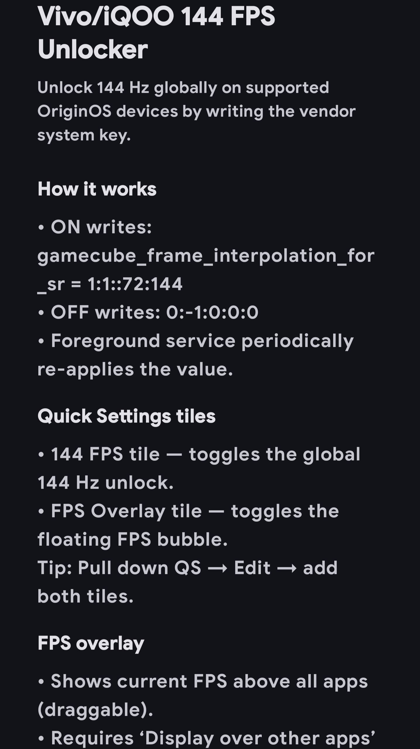 Данное приложение повзоляет выставить 144hz во всех приложениях на телефонах Vivo и IQOO с оболочкой OriginOS. Что можно делать? — Включить 144hz — Вывести на экран счетчик FPS Приложение имеет открытый исходный код на гитхаб (Ссылка на репозиторий в приложении) ⚠️: Перед тем как написать негативный отзыв: Работа на разных устройствах, версиях прошивки может отличаться если хотите сообщить о баге напишите на почту! ⚠️⚠️: НЕ РАБОТАЕТ НА ГЛОБАЛЬНОЙ ПРОШИВКИ ВООБЩЕ НИКАК НЕ ПРИ КАКИХ УСЛОВИЯХ, ЭТО НЕ БАГ НЕ ПИШИТЕ НА ПОЧТУ ЗАСОРЯЕТЕ ЕЁ!!!