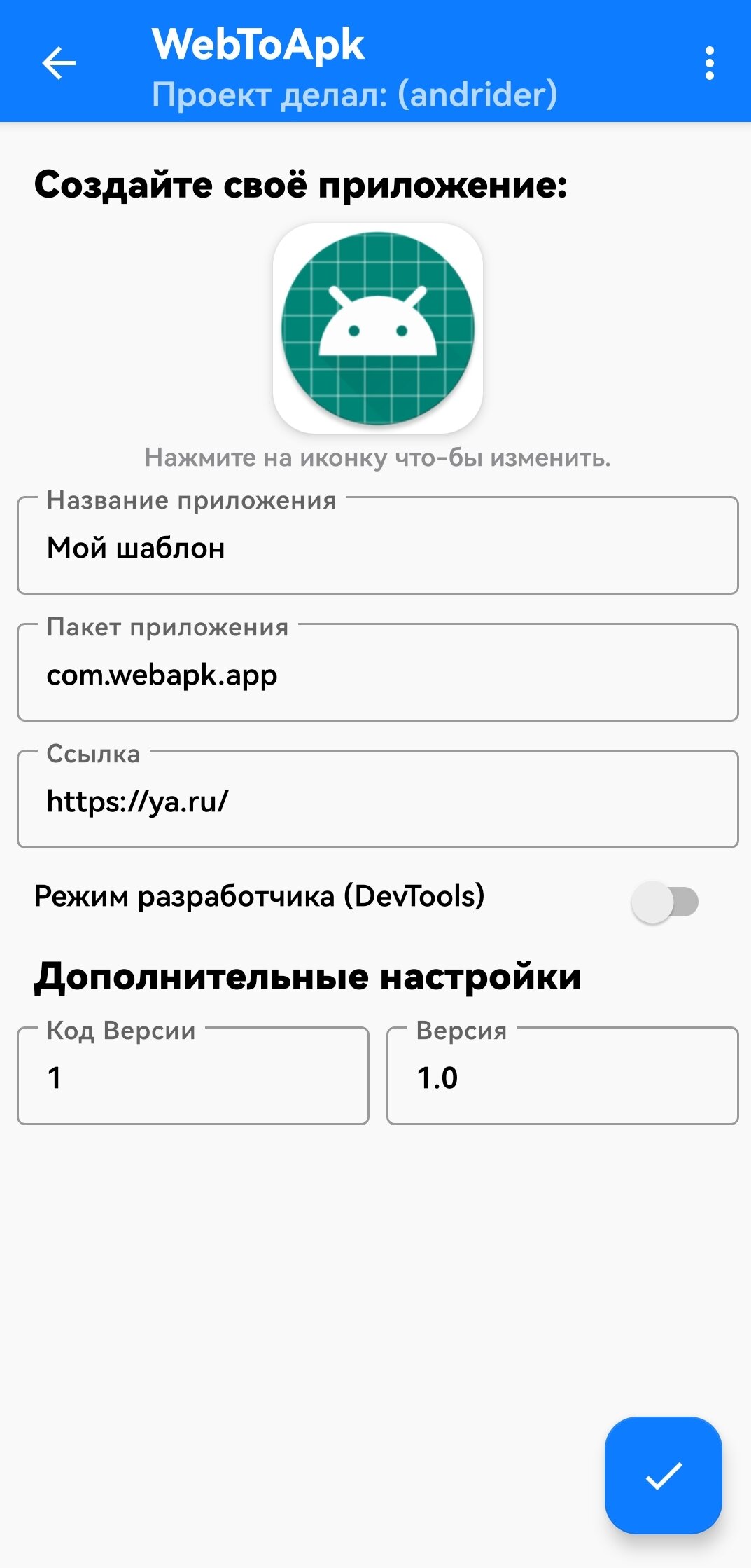 Просто введи URL, добавь иконку и получи готовый APK файл. Никакого кода, никакой Android Studio.