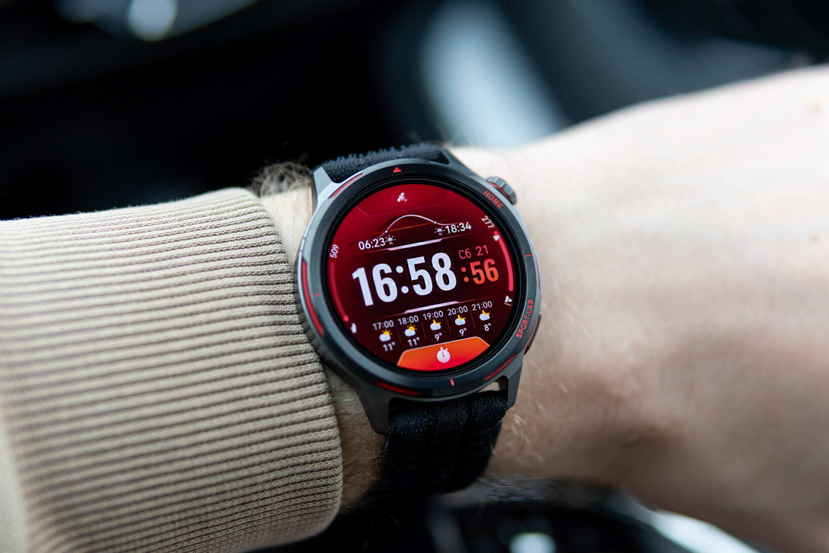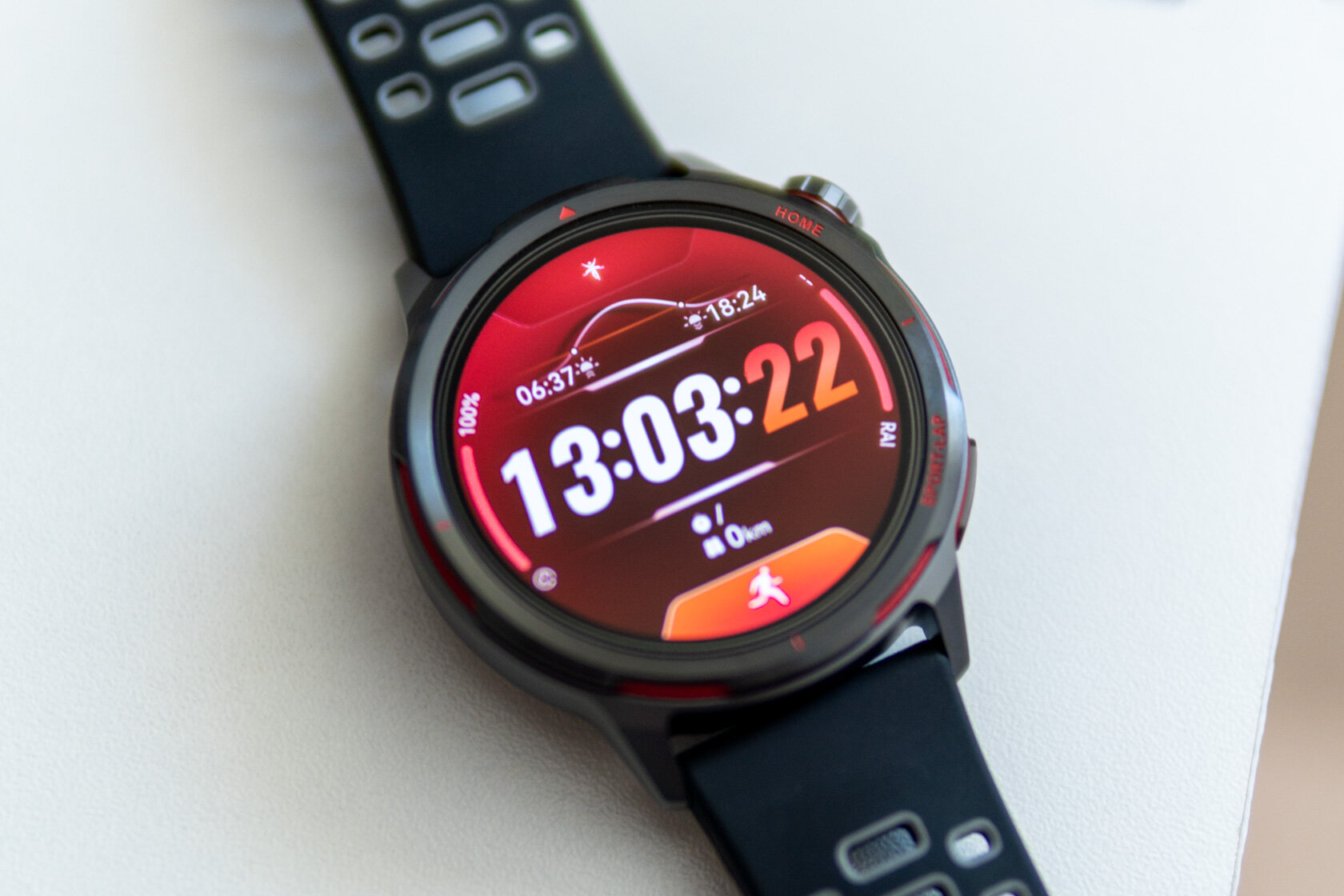 Вокруг дисплея расположен безель с набором ярких декоративных акцентов красного цвета (в синей расцветке они синие, а в серебристой — оранжевые). Сверху указана стрелка, справа, слева и снизу имеются небольшие чёрточки — они, в теории, помогут быстрее ориентироваться во времени в случае с таймерами или классическими циферблатами.
