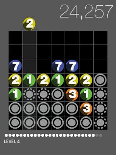 А пока видео нет, описание основного принципа игры в Drop7 продублирую все-таки текстом. Изначально на экране имеется некоторое количество цветных шариков с цифрами, некоторые из объектов серого цвета. Вверху висит шарик, который вам необходимо разместить на поле. Перетаскивая шарик, вы должны его расположить на решето игрового поля. На каждом кружке имеется цифра. Пропадает шарик с экрана и происходит соответствующее присуждение очков в случае, если вам удастся правильно разместить шарик – согласно цифре изображенной на нем. Если на шарике изображена единица, то он пропадет, если будет единственным в ряду или столбце. Если изображена семерка, значит такой шарик следует разместить последним (игровое поле – это квадрат семь на семь)в какой-нибудь столбец или ряд. После того как шарик пропадает, расположенные над ним предметы опускают ниже по столбцу, таким образом создаются цепочки действий. Чем больше шариков пропадает подряд, тем больше очков вам присуждается. Теперь пара слов о серых шарах. Когда вы «убираете» шар, расположенный по соседству с серым, то последний трескается. В следующий раз он лопнет, а на его месте появится какой-нибудь цветной шарик.