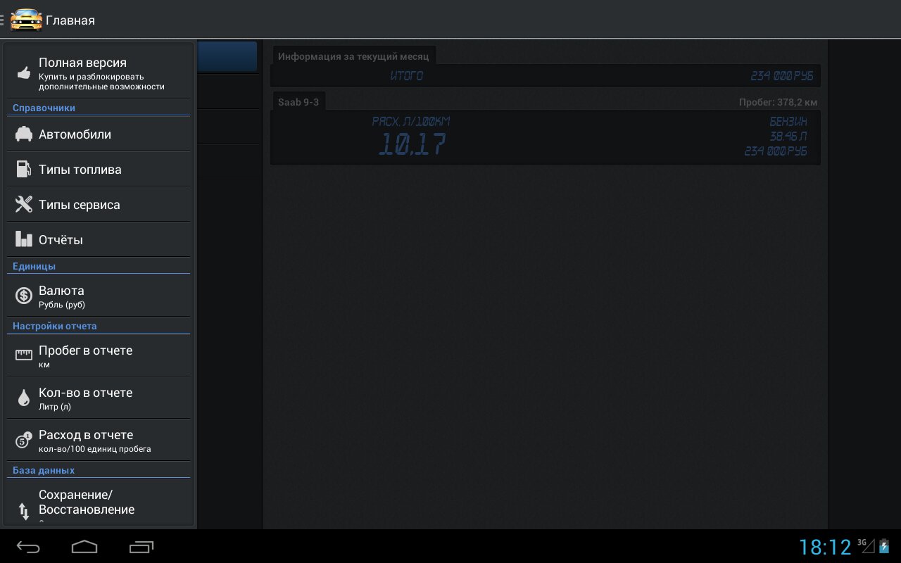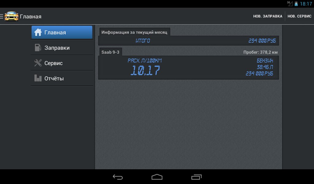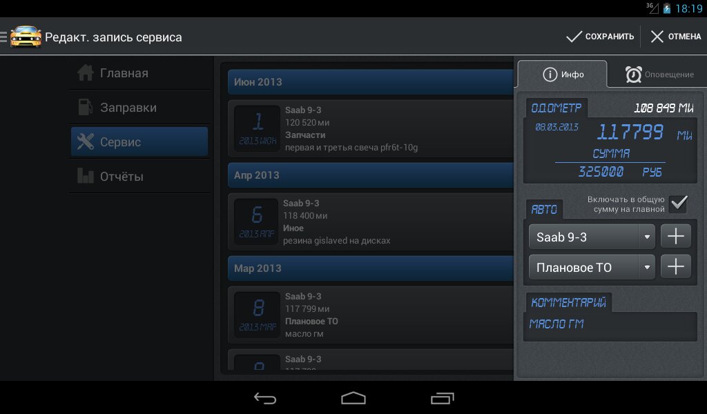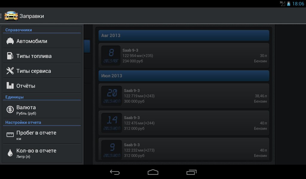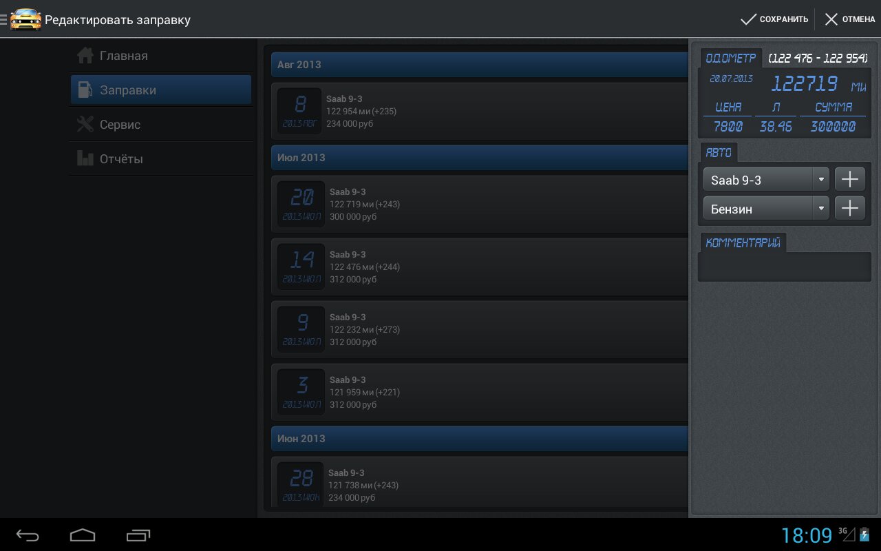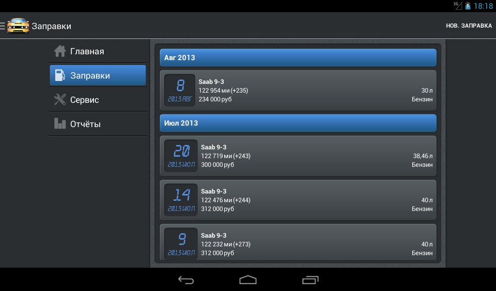 Учет заправок автомобиля и его сервисного обслуживания На главной закладке отображаются сведения о заправках и техническом обслуживании автомобилей за текущий месяц, а так же средний расход топлива. В закладке «Заправки» находится список зарегистрированных заправок. В закладке «Сервис» находится список проведенного сервисного обслуживания автомобиля. В закладке «Отчёты» Вы можете создавать отчёты в интересующих вас разрезах, периодах и фильтрах. Есть возможность сохранять настройки сгенерированного Вами отчета, и при следующем запуске программы, при переходе на эту закладку, Вам сразу же будет показан отчёт отмеченный галочкой «По умолчанию». В приложении существуют три справочника — «Автомобили», «Типы топлива» и «Очёты». Отмеченный галочкой в справочнике элемент будет загружаться в элементы выбора автоматически (например при создании записи о заправке, при появлении диалога, комбо боксы будут автоматически заполнены). В настройках приложения и автомобиля Вы можете выбрать используемые в Вашем регионе единицы измерения (литры-галоны, километры-мили, расчет расхода топлива), а также валюту. Также в настройках находится элементы управления базы данных приложения. Вы можете очистить списки, а также произвести сохранение/восстановление записей о заправках, сервисном обслуживании, справочников и настроек. (Например при переносе на другое устройство, или при обновлении прошивки устройства) Данные экспортируются на флеш-карту в папку «Cars Manager».