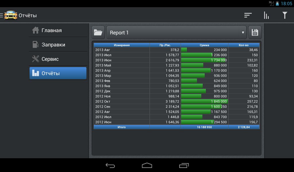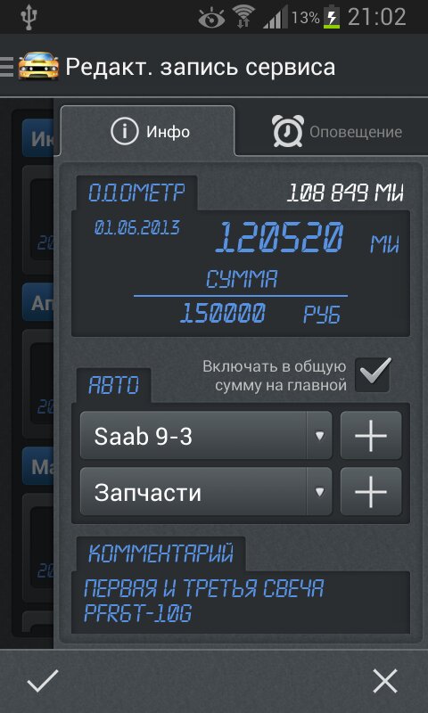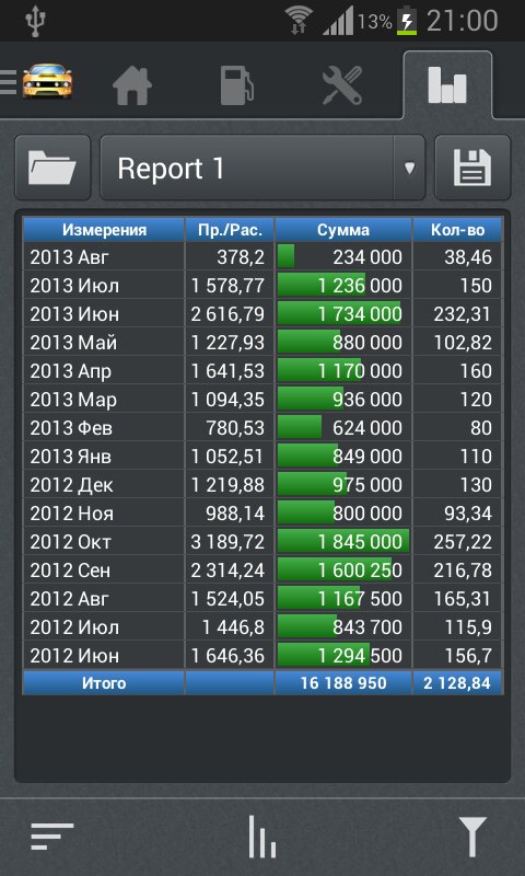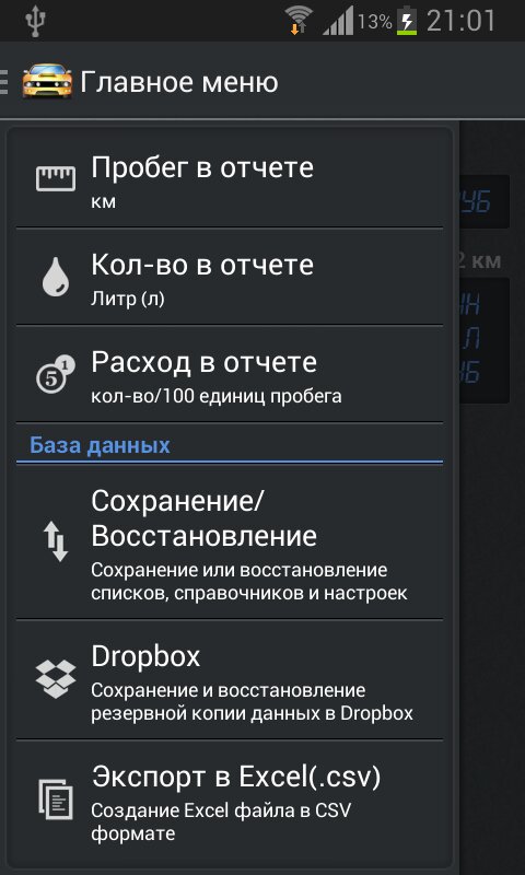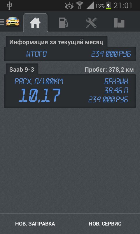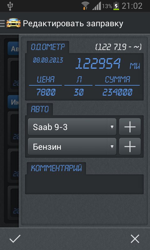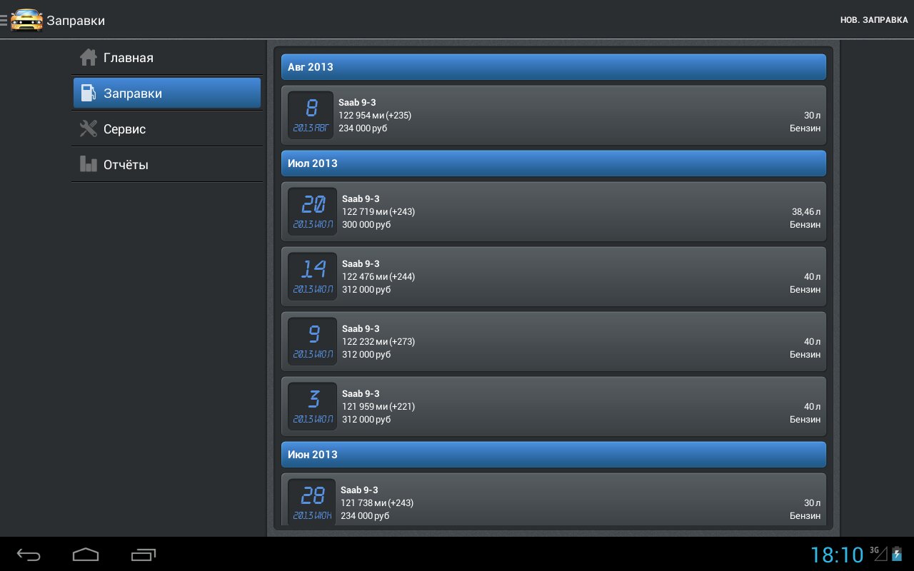 Учет заправок автомобиля и его сервисного обслуживания На главной закладке отображаются сведения о заправках и техническом обслуживании автомобилей за текущий месяц, а так же средний расход топлива. В закладке «Заправки» находится список зарегистрированных заправок. В закладке «Сервис» находится список проведенного сервисного обслуживания автомобиля. В закладке «Отчёты» Вы можете создавать отчёты в интересующих вас разрезах, периодах и фильтрах. Есть возможность сохранять настройки сгенерированного Вами отчета, и при следующем запуске программы, при переходе на эту закладку, Вам сразу же будет показан отчёт отмеченный галочкой «По умолчанию». В приложении существуют три справочника — «Автомобили», «Типы топлива» и «Очёты». Отмеченный галочкой в справочнике элемент будет загружаться в элементы выбора автоматически (например при создании записи о заправке, при появлении диалога, комбо боксы будут автоматически заполнены). В настройках приложения и автомобиля Вы можете выбрать используемые в Вашем регионе единицы измерения (литры-галоны, километры-мили, расчет расхода топлива), а также валюту. Также в настройках находится элементы управления базы данных приложения. Вы можете очистить списки, а также произвести сохранение/восстановление записей о заправках, сервисном обслуживании, справочников и настроек. (Например при переносе на другое устройство, или при обновлении прошивки устройства) Данные экспортируются на флеш-карту в папку «Cars Manager».