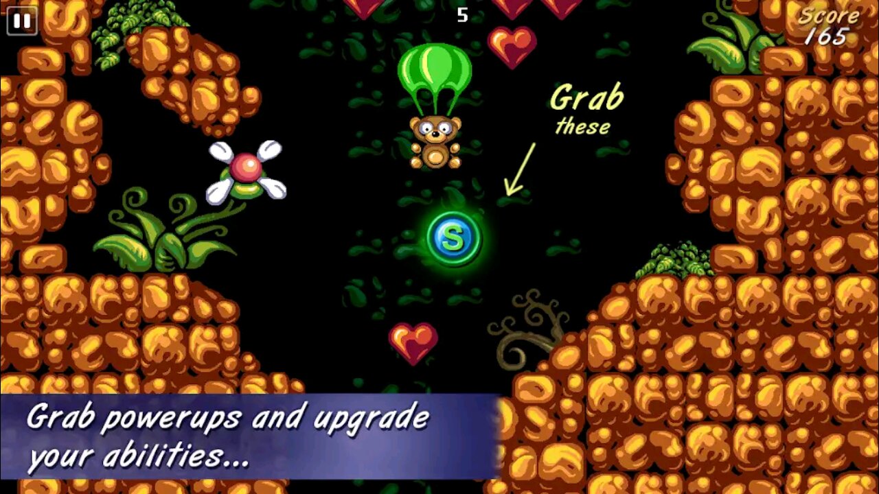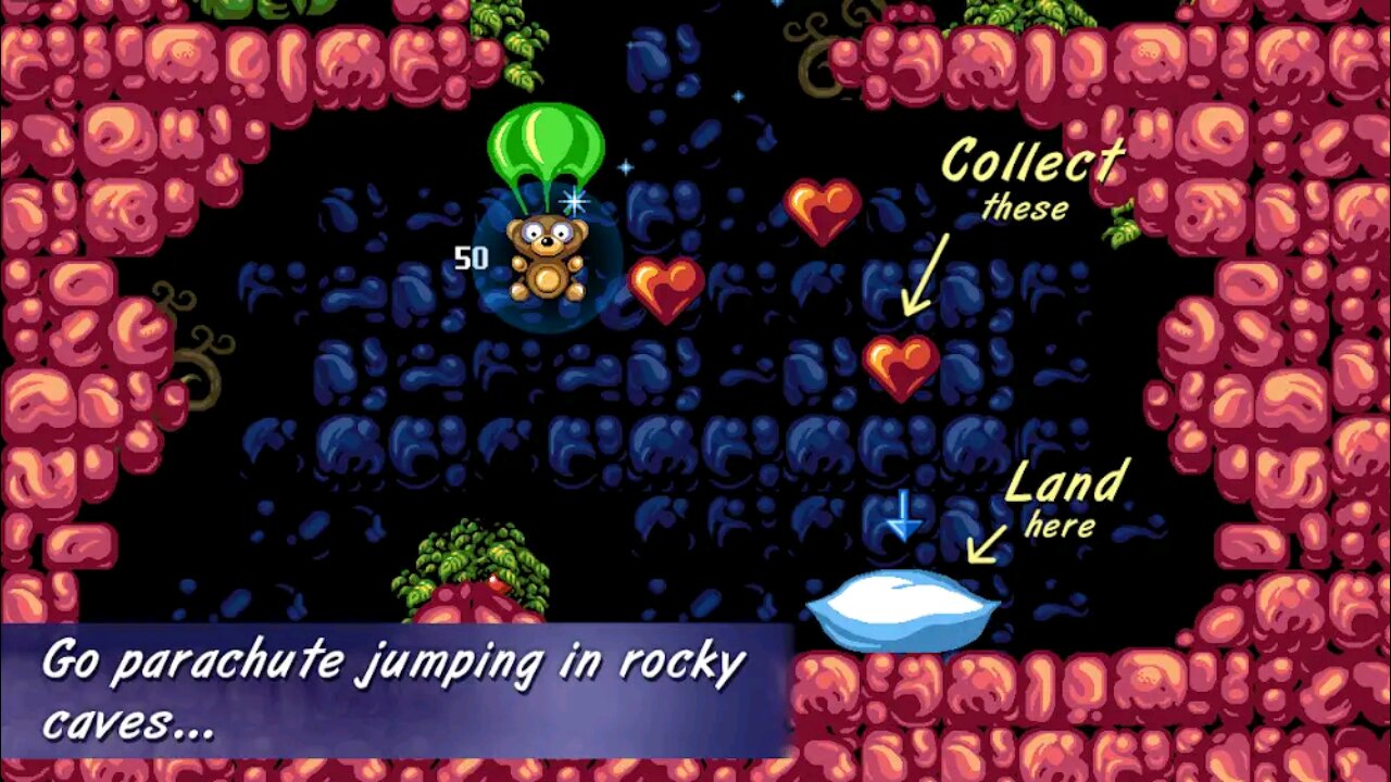 Прыгайте по скалистым пещерам Пушистой страны и стремитесь к пушистой подушке на дне каждой пещеры. Постарайтесь собрать как можно больше бонусных предметов, не сломав парашют.