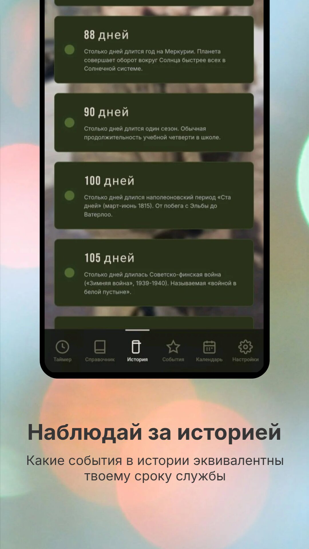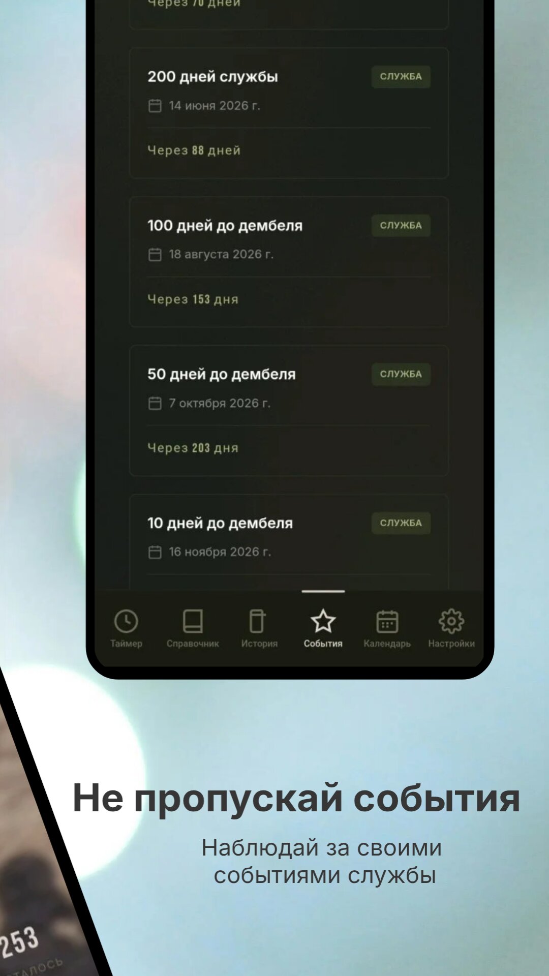 Храните важные даты службы: присяга, первое увольнение, другие памятные дни. Ведите свой календарь дембеля и добавляйте заметки — всё в одном профиле.