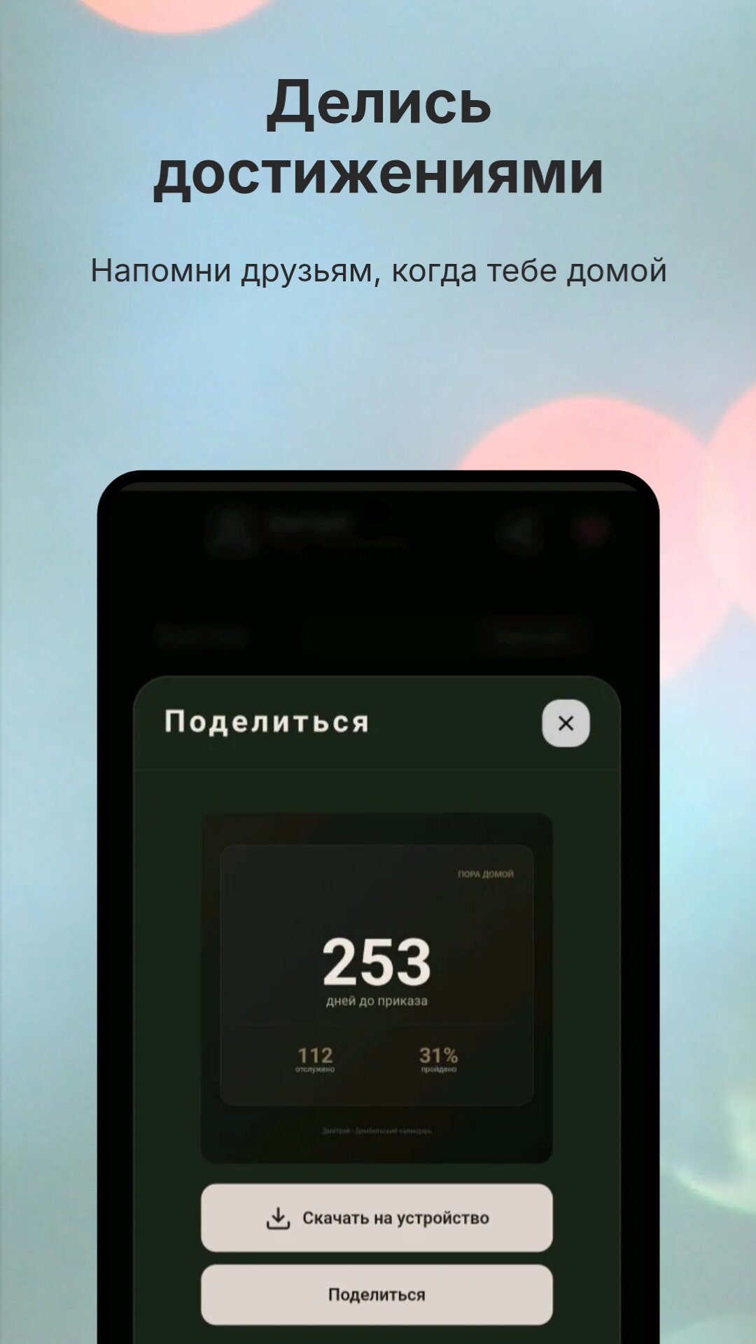 Одним касанием отправьте скриншот с вашим дембельским таймером друзьям и близким. Пусть все знают, что вы уже на пути домой.
