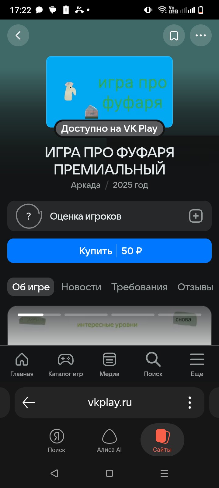 Ребят теперь игра «Игра про Фуфаря» стоит 50 ₽. Место 166 ₽ вот ссылка 🔗 vkplay.ru/play/game/igra-pro-fufary/?mt_link_id=hxecq9
