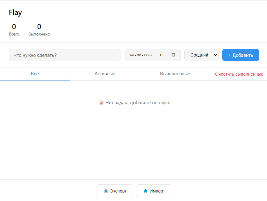 - Гибкость данных: встроенные функции экспорта и импорта списка задач в формате JSON для создания бэкапов или переноса данных.