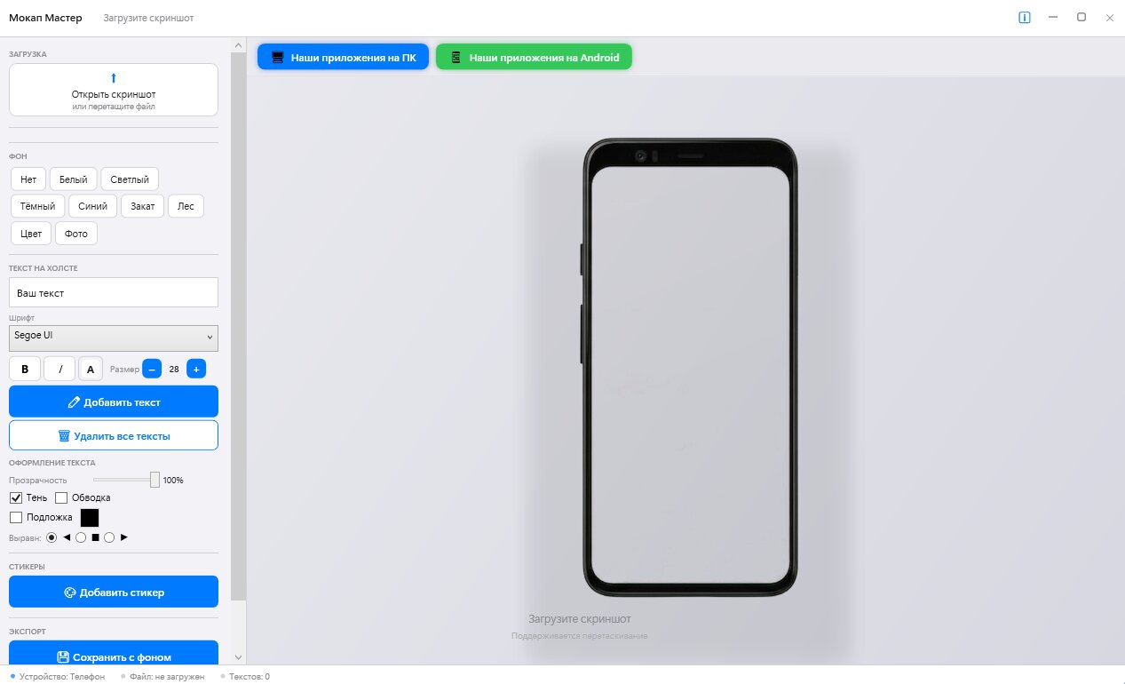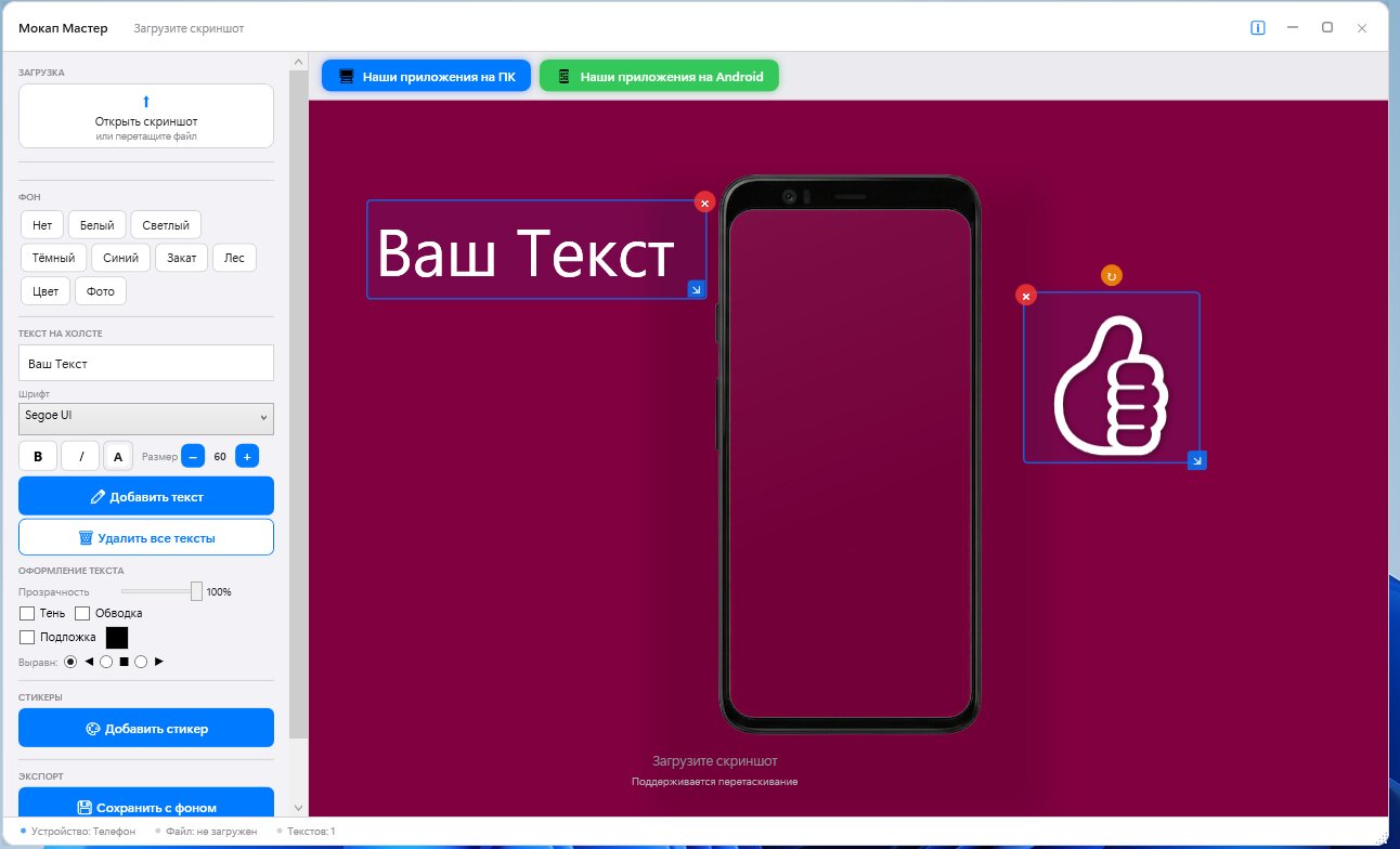 Мокап Мастер — это инструмент для создания мокапов (макетов) приложений. Ты загружаешь скриншот своего приложения, и программа помещает его внутрь рамки смартфона, создавая красивую презентационную картинку.