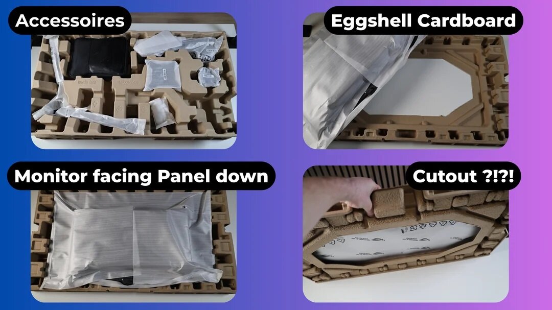 Свою популярность монитор получил благодаря технологии Tandem OLED, высококлассным функциям и датчику приближения NEO, который уменьшает выгорание пикселей. Видимо, все деньги ушли на производство самих устройств, потому что нельзя объяснить, почему они поставляются в упаковках, изготовленных из материала, который обычно применяется для производства коробок для яиц. Но что больше всего поражает — огромный вырез в нижней части упаковки.
